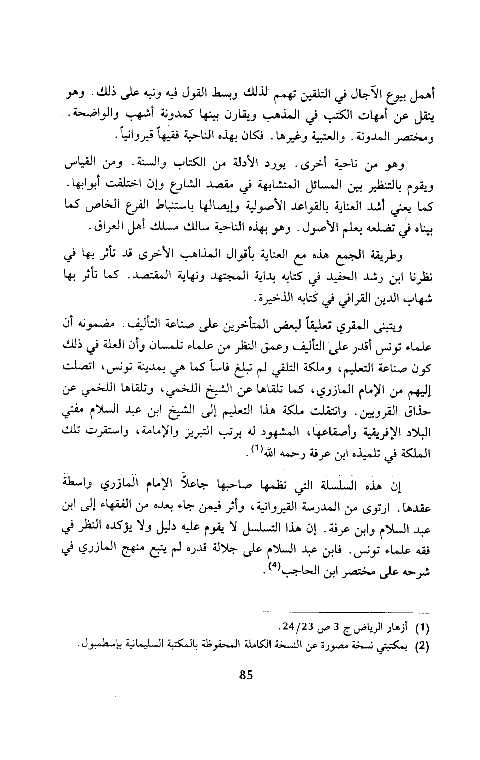 إن هذه السلسلة التي نظمها صاحبها جاعلًا الإِمام المازري واسطة عقدها. ارتوى من المدرسة القيروانية، وأثر فيمن جاء بعده من الفقهاء إلى ابن عبد السلام وابن عرفة. إن هذا التسلسل لا يقوم عليه دليل ولا يؤكده النظر في فقه علماء تونس. فابن عبد السلام على جلالة قدره لم يتبع منهج المازري في شرحه على مختصر ابن الحاجب (¬2).