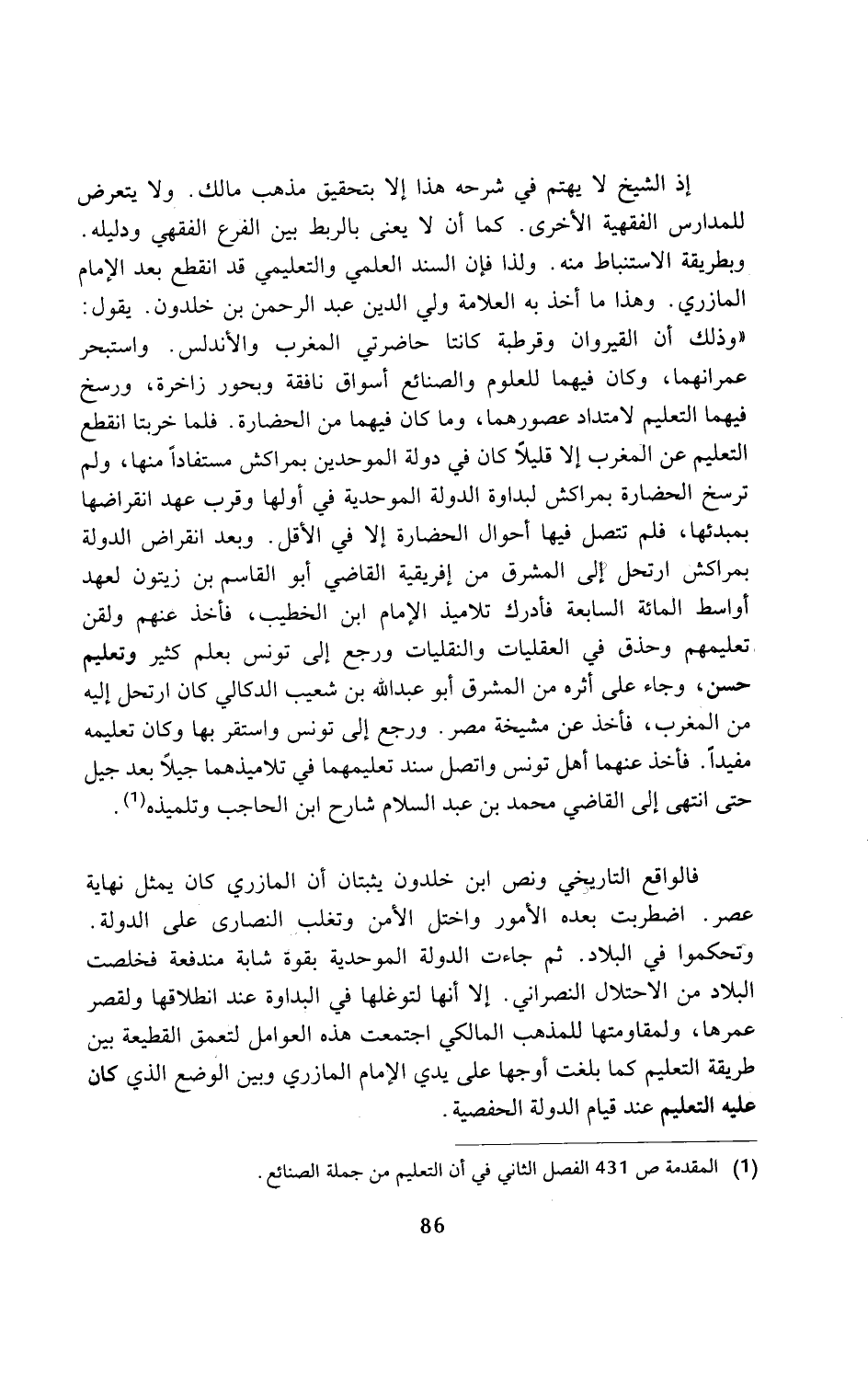 إذ الشيخ لا يهتم في شرحه هذا إلا بتحقيق مذهب مالك. ولا يتعرض للمدارس الفقهية الأخرى. كما أن لا يعني بالربط بين الفرع الفقهي ودليله. وبطريقة الاستنباط منه. ولذا فإن السند العلمي والتعليمي قد انقطع بعد الإِمام المازري. وهذا ما أخذ به العلامة ولي الدين عبد الرحمن بن خلدون. يقول: "وذلك أن القيروان وقرطبة كانتا حاضرتي المغرب والأندلس. واستبحر عمرانهما، وكان فيهما للعلوم والصنائع أسواق نافقة وبحور زاخرة، ورسخ فيهما التعليم لامتداد عصورهما، وما كان فيهما من الحضارة. فلما خربتا انقطع التعليم عن المغرب إلا قليلًا كان في دولة الموحدين بمراكش مستفادًا منها، ولم ترسخ الحضارة بمراكش لبداوة الدولة الموحدية في أولها وقرب عهد انقراضها بمبدئها، فلم تتصل فيها أحوال الحضارة إلا في الأقل. وبعد انقراض الدولة بمراكش ارتحل إلى المشرق من إفريقية القاضي أبو القاسم بن زيتون لعهد أواسط المائة السابعة فأدرك تلاميذ الإِمام ابن الخطيب، فأخذ عنهم ولقن تعليمهم وحذق في العقليات والنقليات ورجع إلى تونس بعلم كثير وتعليم حسن، وجاء على أثره من المشرق أبو عبد الله بن شعيب الدكالي كان ارتحل إليه من المغرب، فأخذ عن مشيخة مصر. ورجع إلى تونس واستقر بها وكان تعليمه مفيدًا. فأخذ عنهما أهل تونس واتصل سند تعليمهما في تلاميذهما جيلًا بعد جيل حتى انتهى إلى القاضي محمَّد بن عبد السلام شارح ابن الحاجب وتلميذه (¬1).