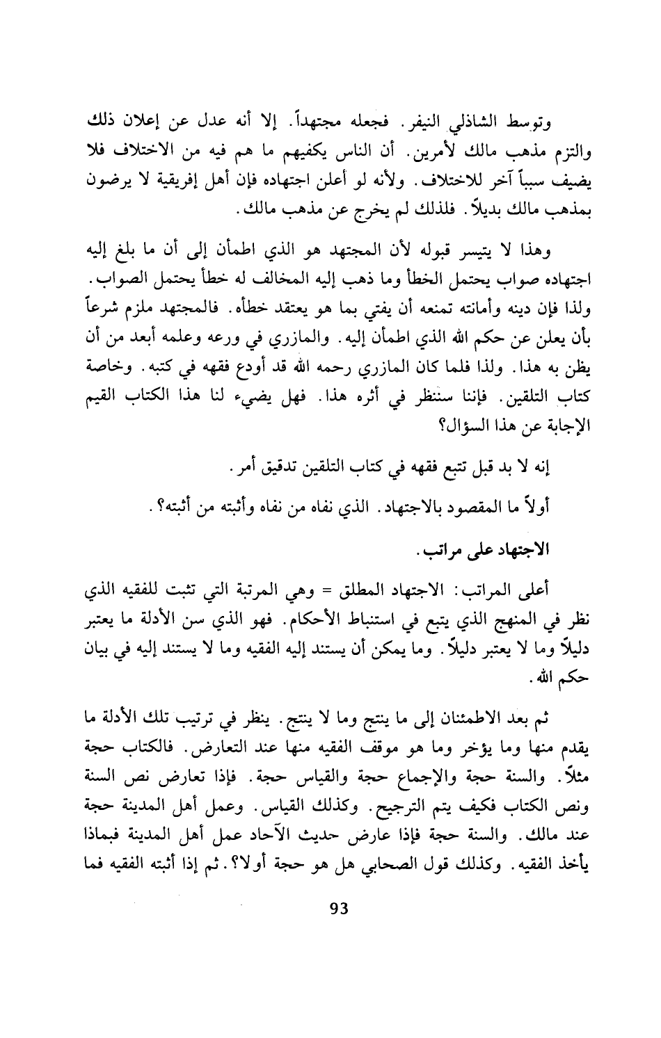 وهذا لا يتيسر قبوله لأن المجتهد هو الذي اطمأن إلى أن ما بلغ إليه اجتهاده صواب يحتمل الخطأ وما ذهب إليه المخالف له خطأ يحتمل الصواب. ولذا فإن دينه وأمانته تمنعه أن يفتي بما هو يعتقد خطأه. فالمجتهد ملزم شرعًا بأن يعلن عن حكم الله الذي اطمأن إليه. والمازري في ورعه وعلمه أبعد من أن يظن به هذا. ولذا فلما كان المازري رحمه الله قد اودع فقهه في كتبه. وخاصة كتاب التلقين. فإننا سننظر في أثره هذا. فهل يضيء لنا هذا الكتاب القيم الإجابة عن هذا السؤال؟