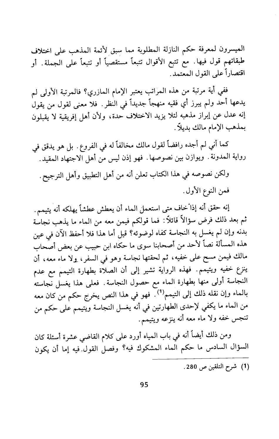 ففي آية مرتبة من هذه المراتب يعتبر الإِمام المازري؟ فالمرتبة الأولى لم يدعها أحد ولم يبرز أي فقيه منهجًا جديدًا في النظر. فلا معنى لقول من يقول إنه عدل عن إبراز مذهبه لئلا يزيد الاختلاف حدة، ولأن أهل إفريقية لا يقبلون بمذهب الإِمام مالك بديلًا.