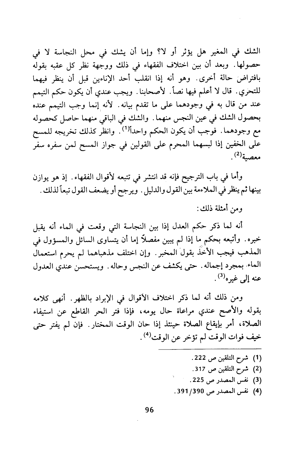 حصولها. وبعد أن بين اختلاف الفقهاء في ذلك ووجهة نظر كل عقبه بقوله بافتراض حالة أخرى. وهو أنه إذا انقلب أحد الإناءين قبل أن ينظر فيهما للتحري. قال لا أعلم فيها نصًا. لأصحابنا. ويجب عندي أن يكون حكم التيمم عند من قال به في وجودهما على ما تقدم بيانه. لأنه إنما وجب التيمم عنده بحصول الشك في عين النجس منهما. والشك في الباقي منهما حاصل كحصوله مع وجودهما. فوجب أن يكون الحكم واحدًا (¬1). وانظر كذلك تخريجه للمسح على الخفين إذا لبسهما المحرم على القولين في جواز المسح لمن سفره سفر معصية (¬2).