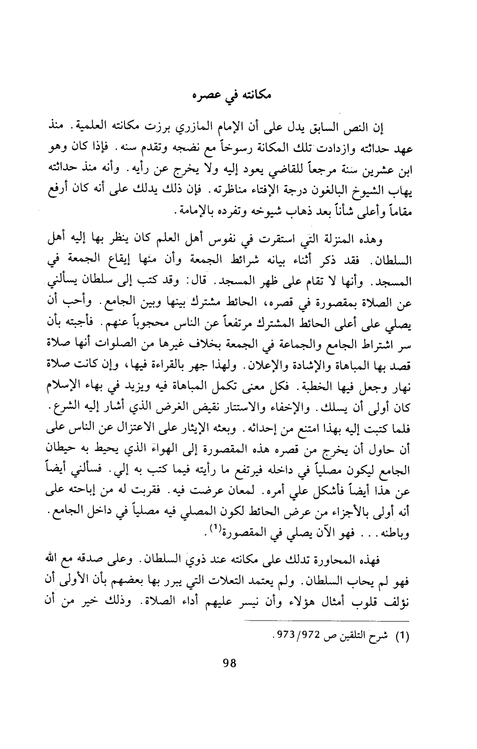 وهذه المنزلة التي استقرت في نفوس أهل العلم كان ينظر بها إليه أهل السلطان. فقد ذكر أثناء بيانه شرائط الجمعة وأن منها إيقاع الجمعة في المسجد. وأنها لا تقام على ظهر المسجد. قال: وقد كتب إلى سلطان يسألني عن الصلاة بمقصورة في قصره، الحائط مشترك بينها وبين الجامع. وأحب أن يصلي على أعلى الحائط المشترك مرتفعًا عن الناس محجوبًا عنهم. فأجبته بأن سر اشتراط الجامع والجماعة في الجمعة بخلاف غيرها من الصلوات أنها صلاة قصد بها المباهاة والإشادة والإعلان. ولهذا جهر بالقراءة فيها، وإن كانت صلاة نهار وجعل فيها الخطبة. فكل معنى تكمل المباهاة فيه ويزيد في بهاء الإِسلام كان أولى أن يسلك. والإخفاء والاستتار نقيض الغرض الذي أشار إليه الشرع. فلما كتبت إليه بهذا امتنع من إحداثه. وبعثه الإيثار على الاعتزال عن الناس على أن حاول أن يخرج من قصره هذه المقصورة إلى الهواء الذي يحيط به حيطان الجامع ليكون مصليًا في داخله فيرتفع ما رأيته فيما كتب به إلي. فسألني أيضًا عن هذا أيضًا فأشكل علي أمره. لمعان عرضت فمِه. فقربت له من إباحته على أنه أولى بالأجزاء من عرض الحائط لكون المصلي فيه مصليًا في داخل الجامع. وباطنه ... فهو الآن يصلي في المقصورة (¬1).
