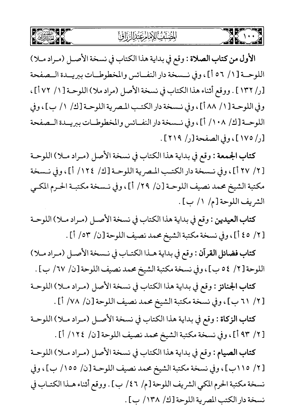 الأول من كتاب الصلاة: وقع في بداية هذا الكتاب في نسخة الأصل (مراد ملا) اللوحة [١/ ٥٦ / أ]، وفي نسخة دار النفائس والمخطوطات ببريدة الصفحة [ر / ١٣٢]. ووقع أثناء هذا الكتاب في نسخة الأصل (مراد ملا) اللوحة [١/ ٧٢ أ]، وفي اللوحة [١/ ٨٨ أ]، وفي نسخة دار الكتب المصرية اللوحة [ك / ١/ ب]، وفي اللوحة [ك / ١٠٨/ أ]، وفي نسخة دار النفائس والمخطوطات ببريدة الصفحة [ر / ١٧٥]، وفي الصفحة [ر / ٢١٩].