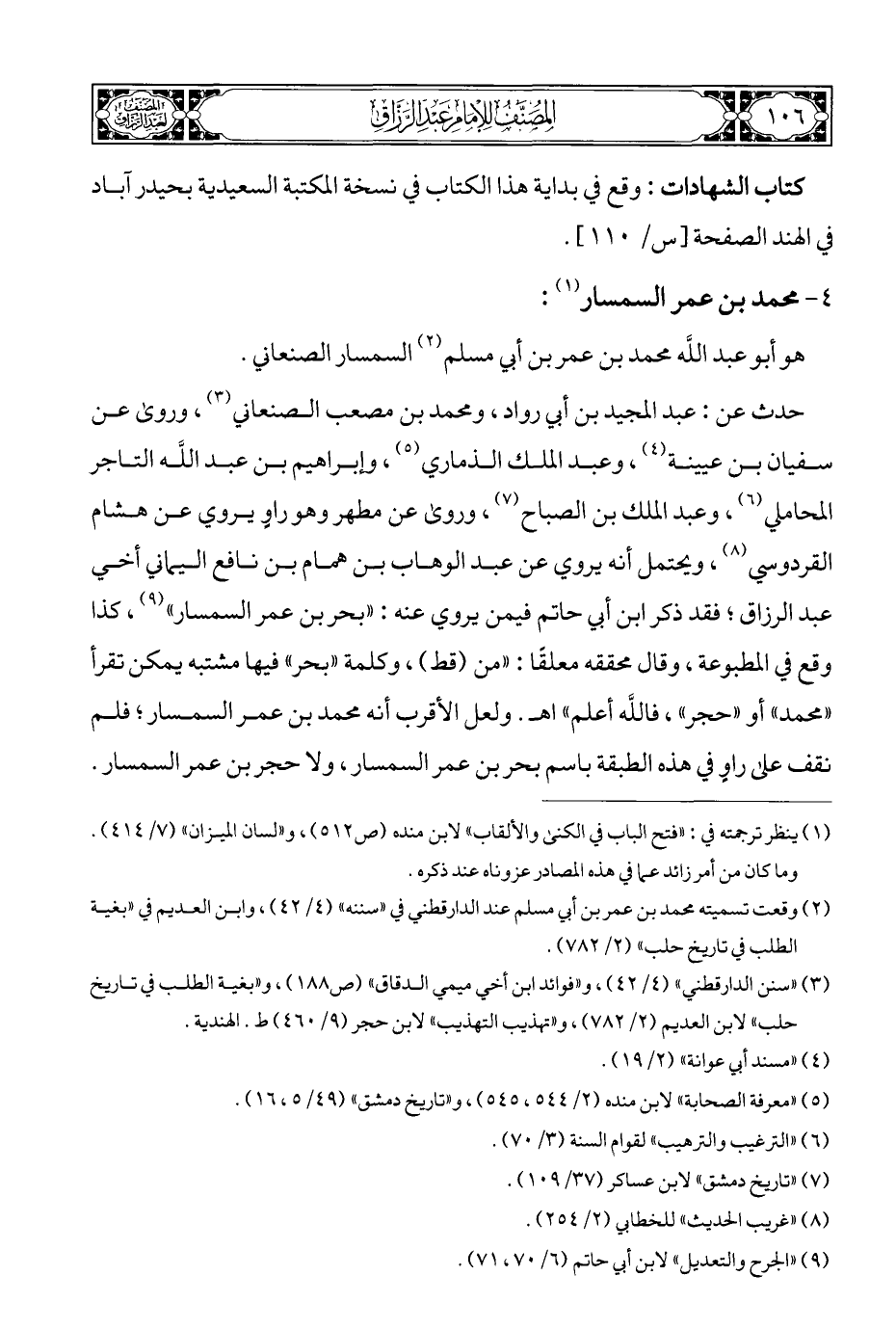 حدث عن: عبد المجيد بن أبي رواد، ومحمد بن مصعب الصنعاني (¬٣)، وروى عن سفيان بن عيينة (¬٤)، وعبد الملك الذماري (¬٥)، وإبراهيم بن عبد الله التاجر المحاملي (¬٦)، وعبد الملك بن الصباح (¬٧)، وروى عن مطهر وهو راوٍ يروي عن هشام القردوسي (¬٨)، ويحتمل أنه يروي عن عبد الوهاب بن همام بن نافع اليماني أخي عبد الرزاق؛ فقد ذكر ابن أبي حاتم فيمن يروي عنه: "بحر بن عمر السمسار" (¬٩)، كذا وقع في المطبوعة، وقال محققه معلقًا: "من (قط)، وكلمة "بحر" فيها مشتبه يمكن تقرأ "محمد" أو "حجر"، فالله أعلم" اهـ. ولعل الأقرب أنه محمد بن عمر السمسار، فلم نقف على راوٍ في هذه الطبقة باسم بحر بن عمر السمسار، ولا حجر بن عمر السمسار.