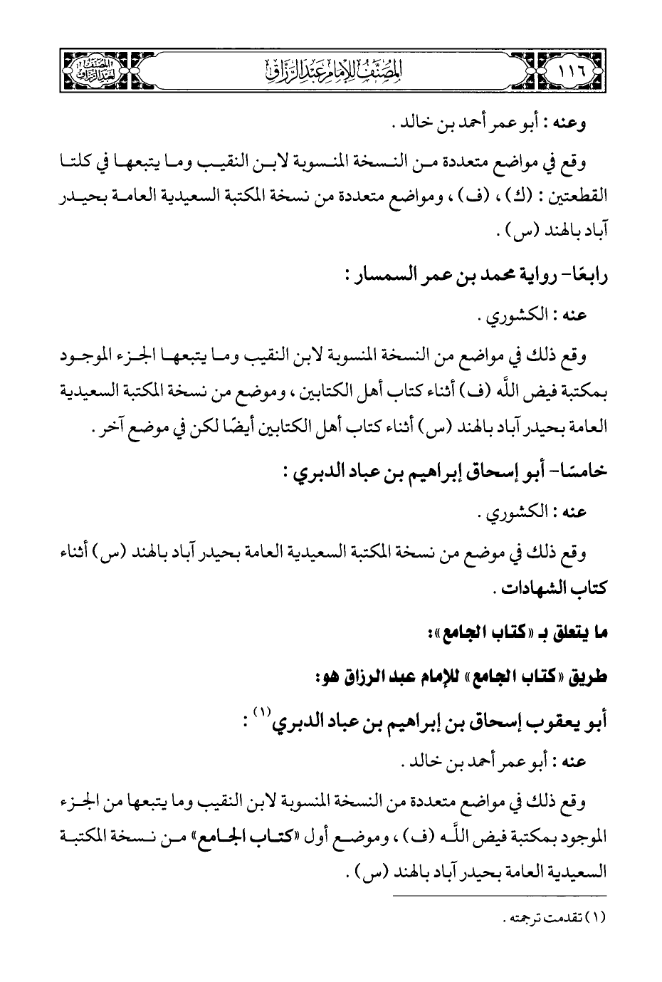 طريق "كتاب الجامع" للإمام عبد الرزاق هو: