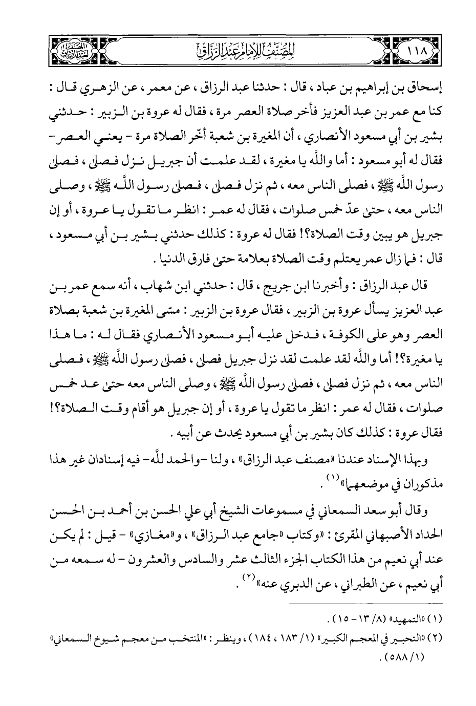 إسحاق بن إبراهيم بن عباد، قال: حدثنا عبد الرزاق، عن معمر، عن الزهري قال: كنا مع عمر بن عبد العزيز فأخر صلاة العصر مرة، فقال له عروة بن الزبير: حدثني بشير بن أبي مسعود الأنصاري، أن المغيرة بن شعبة أخّر الصلاة مرة - يعني العصر - فقال له أبو مسعود: أما والله يا مغيرة، لقد علمت أن جبريل نزل فصلى، فصلى رسول الله - صلى الله عليه وسلم -، فصلى الناس معه، ثم نزل فصى، فصى رسول الله - صلى الله عليه وسلم -، وصلى الناس معه، حتى عدّ خمس صلوات، فقال له عمر: انظر ما تقول يا عروة، أو إن جبريل هو يبين وقت الصلاة؟! فقال له عروة: كذلك حدثني بشير بن أبي مسعود، قال: فما زال عمر يعتلم وقت الصلاة بعلامة حتى فارق الدنيا.