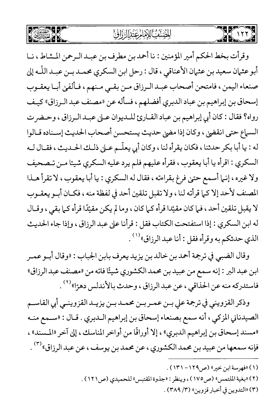 وقال الضبي في ترجمة أحمد بن خالد بن يزيد يعرف بابن الجباب: "وقال أبو عمر ابن عبد البر: إنه سمع من عبيد بن محمد الكشوري شيئًا فاته من "مصنف عبد الرزاق" فاستدركه منه عن الحذاقي، عن عبد الرزاق، وحدث بالأندلس دهرًا" (¬٢).