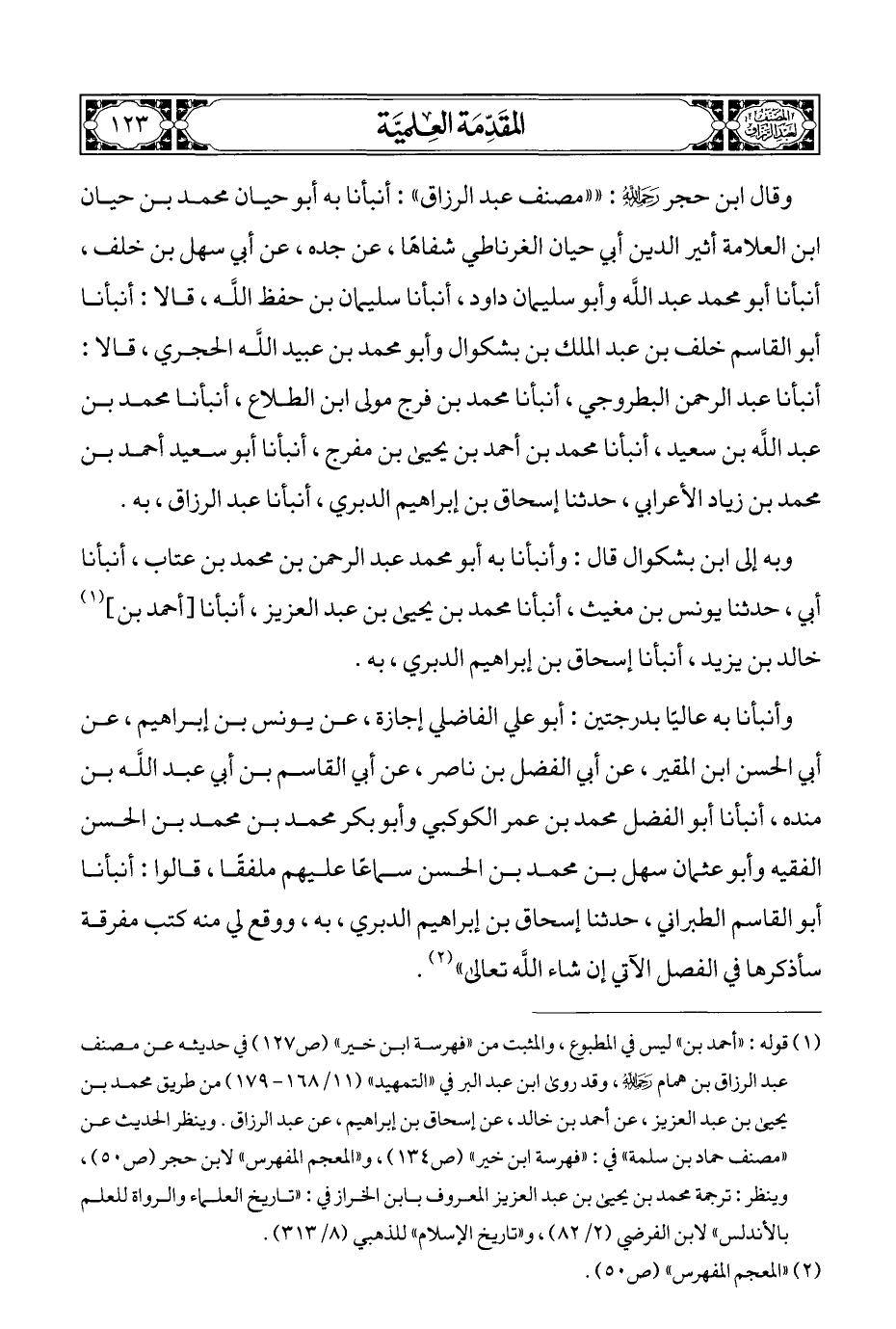 (¬١) قوله: "أحمد بن" ليس في المطبوع، والمثبت من "فهرسة ابن خير" (ص ١٢٧) في حديثه عن مصنف عبد الرزاق بن همام - رحمه الله -، وقد روى ابن عبد البر في "التمهيد" (١١/ ١٦٨ - ١٧٩) من طريق محمد بن يحيى بن عبد العزيز، عن أحمد بن خالد، عن إسحاق بن إبراهيم، عن عبد الرزاق. وينظر الحديث عن "مصنف حماد بن سلمة" في: "فهرسة ابن خير" (ص ١٣٤)، و"المعجم المفهرس" لابن حجر (ص ٥٠)، وينظر: ترجمة محمد بن يحيى بن عبد العزيز المعروف بابن الخراز في: "تاريخ العلماء والرواة للعلم بالأندلس" لابن الفرضي (٢/ ٨٢)، و"تاريخ الإسلام" للذهبي (٨/ ٣١٣).