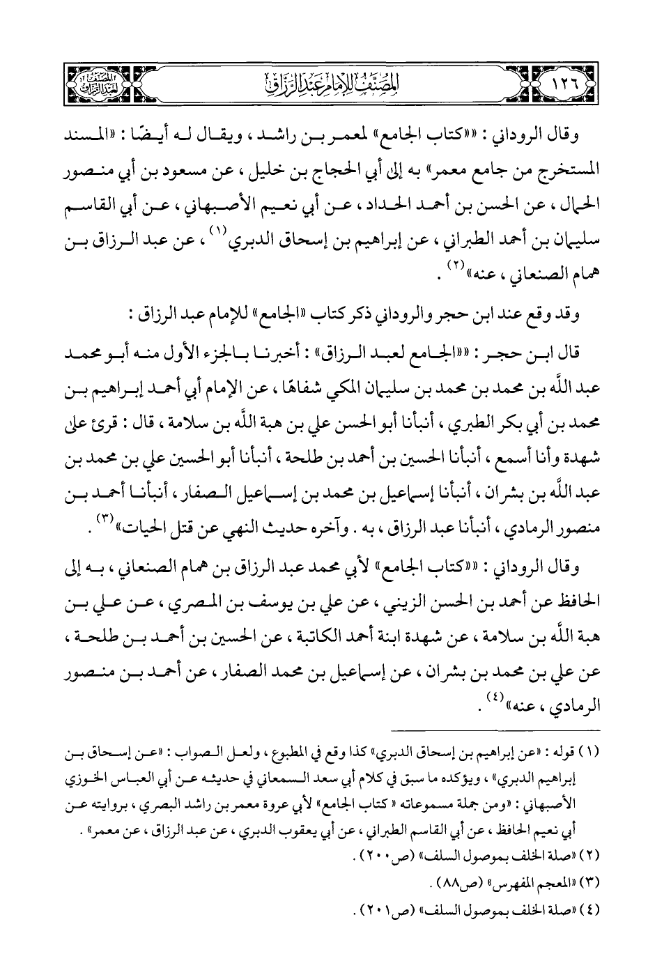 وقد وقع عند ابن حجر والروداني ذكر كتاب "الجامع " للإمام عبد الرزاق: