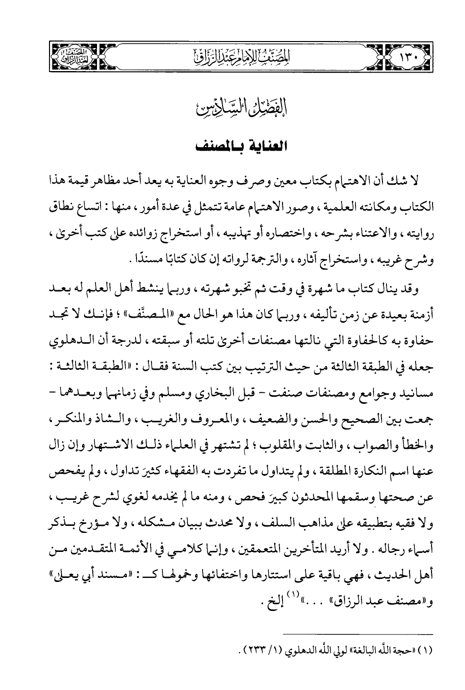 وقد ينال كتاب ما شهرة في وقت ثم تخبو شهرته، وربما ينشط أهل العلم له بعد أزمنة بعيدة عن زمن تأليفه، وربما كان هذا هو الحال مع "المصنَّف"؛ فإنك لا تجد حفاوة به كالحفاوة التي نالتها مصنفات أخرى تلته أو سبقته، لدرجة أن الدهلوي جعله في الطبقة الثالثة من حيث الترتيب بين كتب السنة فقال: "الطبقة الثالثة: مسانيد وجوامع ومصنفات صنفت - قبل البخاري ومسلم وفي زمانهما وبعدهما - جمعت بين الصحيح والحسن والضعيف، والمعروف والغريب، والشاذ والمنكر، والخطأ والصواب، والثابت والمقلوب؛ لم تشتهر في العلماء ذلك الاشتهار وإن زال عنها اسم النكارة المطلقة، ولم يتداول ما تفردت به الفقهاء كثيرَ تداول، ولم يفحص عن صحتها وسقمها المحدثون كبيرَ فحص، ومنه ما لم يخدمه لغوي لشرح غريب، ولا فقيه بتطبيقه علي مذاهب السلف، ولا محدث ببيان مشكله، ولا مؤرخ بذكر أسماء رجاله. ولا أريد المتأخرين المتعمقين، وإنما كلامي في الأئمة المتقدمين من أهل الحديث، فهي باقية على استتارها واختفائها وخمولها كـ: "مسند أبي يعلي" و"مصنف عبد الرزاق" ... " (¬١) إلخ.