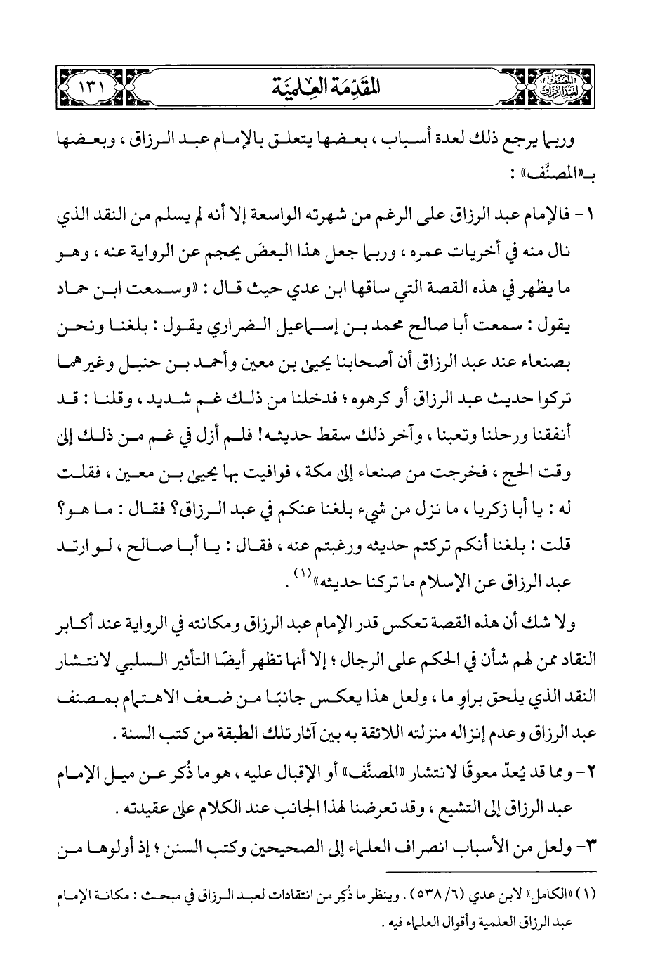 (¬١) "الكامل" لابن عدي (٦/ ٥٣٨). وينظر ما ذُكِر من انتقادات لعبد الرزاق في مبحث: مكانة الإمام عبد الرزاق العلمية وأقوال العلماء فيه.