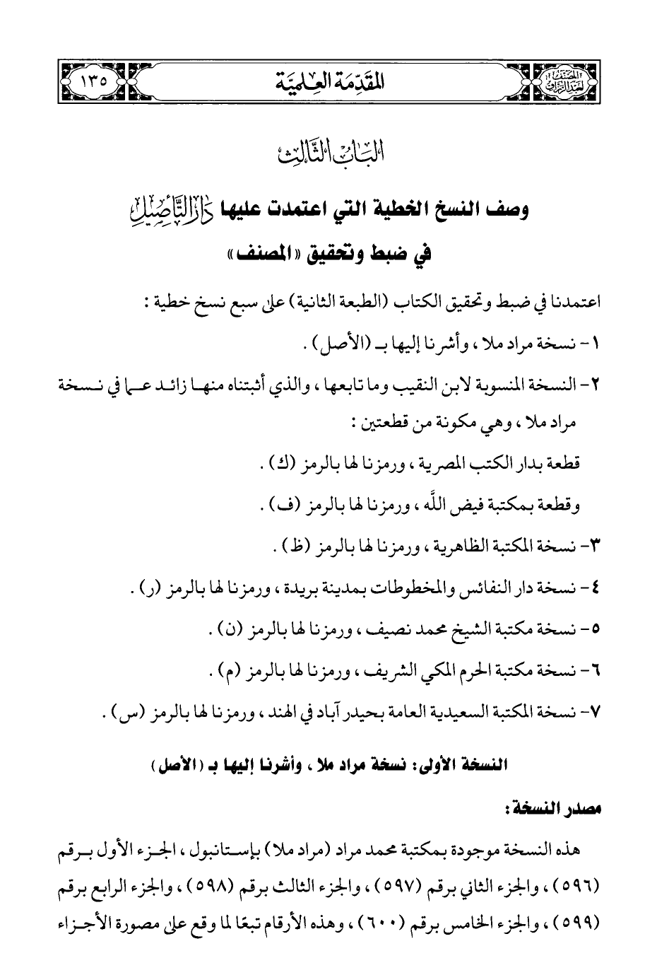 البَابُ الثَّالث وصف النسخ الخطية التي اعتمدت عليها دَار التَّأصِيلِ في ضبط وتحقيق "المصنف"