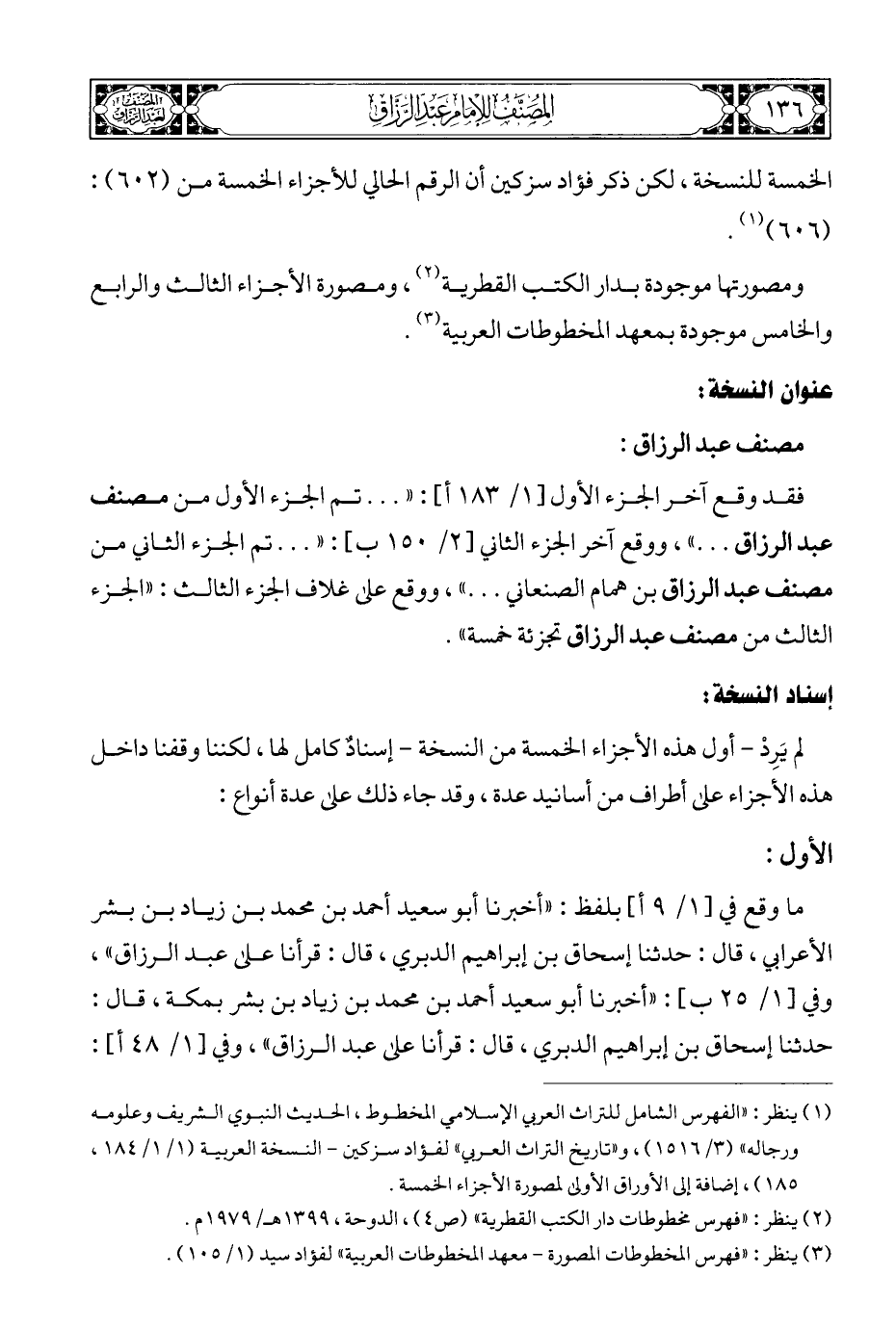 (¬١) ينظر: "الفهرس الشامل للتراث العرلي الإسلامي المخطوط، الحديث النبوي الشريف وعلومه ورجاله" (٣/ ١٥١٦)، و"تاريخ التراث العربي" لفؤاد سزكين - النسخة العربية (١/ ١/ ١٨٤، ١٨٥)، إضافة إلى الأوراق الأولى لمصورة الأجزاء الخمسة.