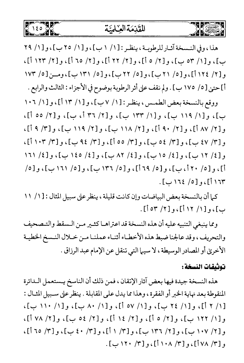 ومما ينبغي التنبيه عليه أن هذه النسخة قد اعتراها كثير من السقط والتصحيف والتحريف، وقد عالجنا ضبط هذه الأخطاء أثناء عملنا من خلال النسخ الخطية الأخرى أو المصادر الوسيطة، لا سيما التي تنقل عن الإمام عبد الرزاق.