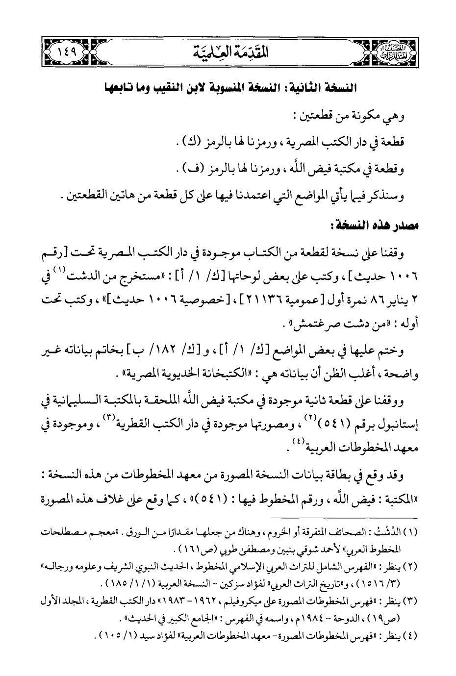 (¬٢) ينظر: "الفهرس الشامل للتراث العرب الإسلامي المخطوط، الحديث النبوي الشريف وعلومه ورجاله" (٣/ ١٥١٦)، و"تاريخ التراث العربي" لفؤاد سزكين - النسخة العربية (١/ ١/ ١٨٥).