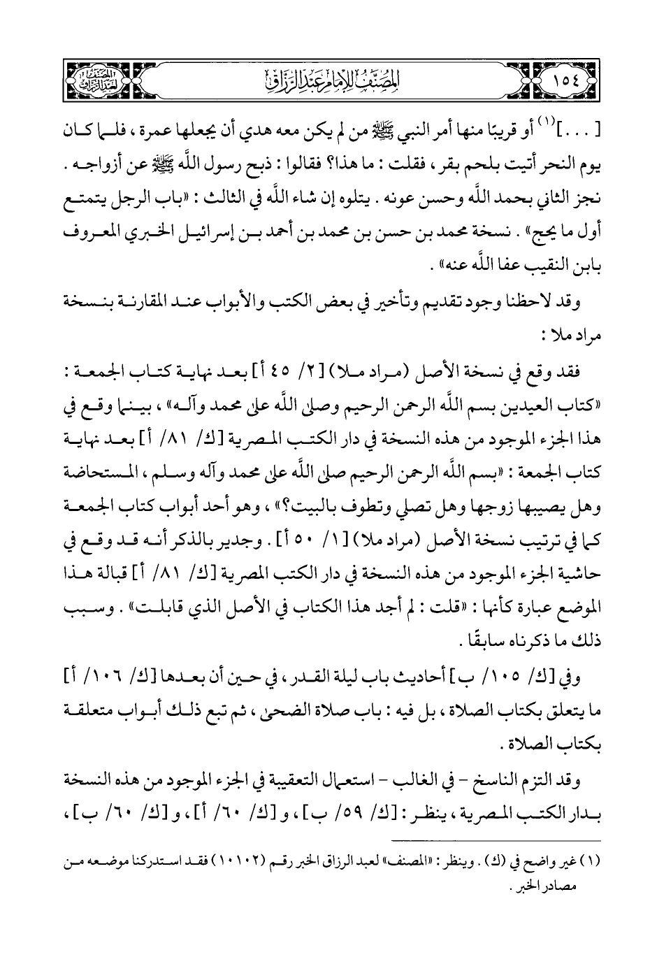 فقد وقع في نسخة الأصل (مراد ملا) [٢/ ٤٥ أ] بعد نهاية كتاب الجمعة: "كتاب العيدين بسم الله الرحمن الرحيم وصلى الله على محمد وآله"، بينما وقع في هذا الجزء الموجود من هذه النسخة في دار الكتب المصرية [ك/ ٨١/ أ] بعد نهاية كتاب الجمعة: "بسم الله الرحمن الرحيم صلى الله على محمد وآله وسلم، المستحاضة وهل يصيبها زوجها وهل تصلي وتطوف بالبيت؟ "، وهو أحد أبواب كتاب الجمعة كما في ترتيب نسخة الأصل (مراد ملا) [١/ ٥٠ أ]. وجدير بالذكر أنه قد وقع في حاشية الجزء الموجود من هذه النسخة في دار الكتب المصرية [ك/ ٨١/ أ] قبالة هذا الموضع عبارة كأنها: "قلت: لم أجد هذا الكتاب في الأصل الذي قابلت". وسبب ذلك ما ذكرناه سابقًا.