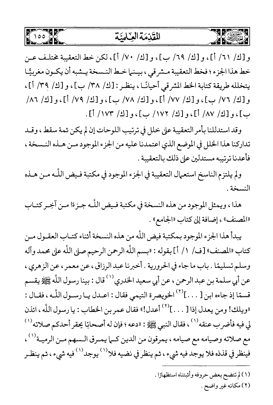يبدأ هذا الجزء الموجود بمكتبة فيض الله من هذه النسخة أثناء كتاب العقول من كتاب "المصنف" [ف/ ١/ أ] بقوله: "بسم الله الرحمن الرحيم صلى الله على محمد وآله وسلم تسليمًا. باب ما جاء في الحرورية. أخبرنا عبد الرزاق، عن معمر، عن الزهري، عن أبي سلمة بن عبد الرحمن، عن أبي سعيد الخدري (¬١) قال: بينا رسول الله - صلى الله عليه وسلم - يقسم قسمًا إذ جاءه ابن [ ... ] (¬٢) الخويصرة التيمي فقال: اعدل يا رسول الله، فقال: "ويلك! ومن يعدل إذا [ ... ] (¬٢) أعدل! " فقال عمر بن الخطاب: يا رسول الله، ائذن لي فيه فأضرب عنقه (¬١)، فقال النبي - صلى الله عليه وسلم -: "دعه؟ فإن له أصحابًا يحقر أحدكم صلاته (¬١) مع صلاته وصيامه مع صيامه، يمرقون من الدين كما يمرق السهم من الرمية (¬١)، فينظر في قذذه فلا يوجد فيه شيء، ثم ينظر في نضيه فلا (¬١) يوجد (¬١) فيه شيء، ثم ينظر