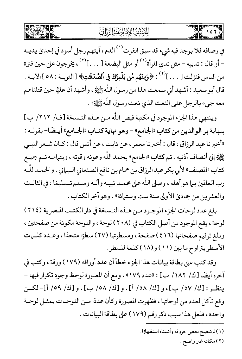 وينتهي هذا الجزء الموجود في مكتبة فيض الله من هذه النسخة [ف/ ٢١٢/ ب] بنهاية بر الوالدين من كتاب "الجامع" - وهو نهاية كتاب "الجامع" أيضا - بقوله: "أخبرنا عبد الرزاق، قال: أخبر نا معمر، عن ثابت، عن أنس قال: كان شعر النبي - صلى الله عليه وسلم - إلى أنصاف أذنيه، تم كتاب "الجامع" بحمد الله وعونه وقوته، وبتمامه تم جميع كتاب "المصنف" لأبي بكر عبد الرزاق بن همام بن نافع الصنعاني اليماني. والحمد للَّه رب العالمين بما هو أهله، وصلى الله على محمد نبيه وآله وسلم تسليمًا، في الثالث والعشرين من جمادى الأولى سنة ست وستمائة". وهو آخر الكتاب.