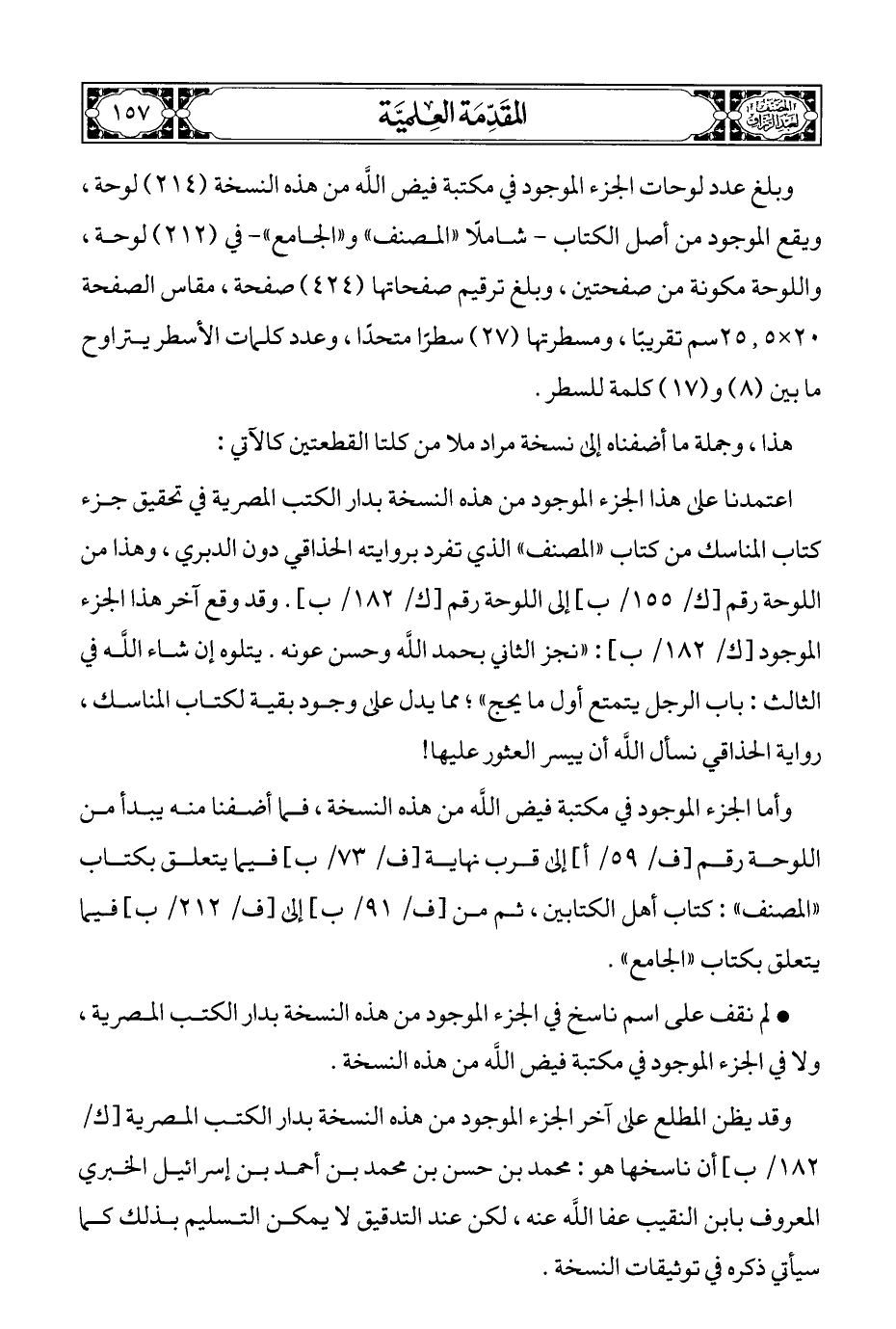 وأما الجزء الموجود في مكتبة فيض الله من هذه النسخة، فما أضفنا منه يبدأ من اللوحة رقم [ف/ ٥٩/ أ] إلى قرب نهاية [ف/ ٧٣/ ب] فيما يتعلق بكتاب "المصنف": كتاب أهل الكتابين، ثم من [ف/ ٩١/ ب] إلى [ف/ ٢١٢/ ب] فيما يتعلق بكتاب "الجامع".