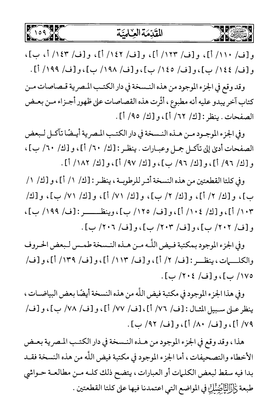 هذا، وقد وقع في الجزء الموجود من هذه النسخة في دار الكتب المصرية بعض الأخطاء والتصحيفات، أما الجزء الموجود في مكتبة فيض الله من هذه النسخة فقد بدا فيه سقط لبعض الكلمات أو العبارات، يتضح ذلك كله من مطالعة حواشي طبعة، دار التأصيل في المواضع التي اعتمدنا فيها على كلتا القطعتين.