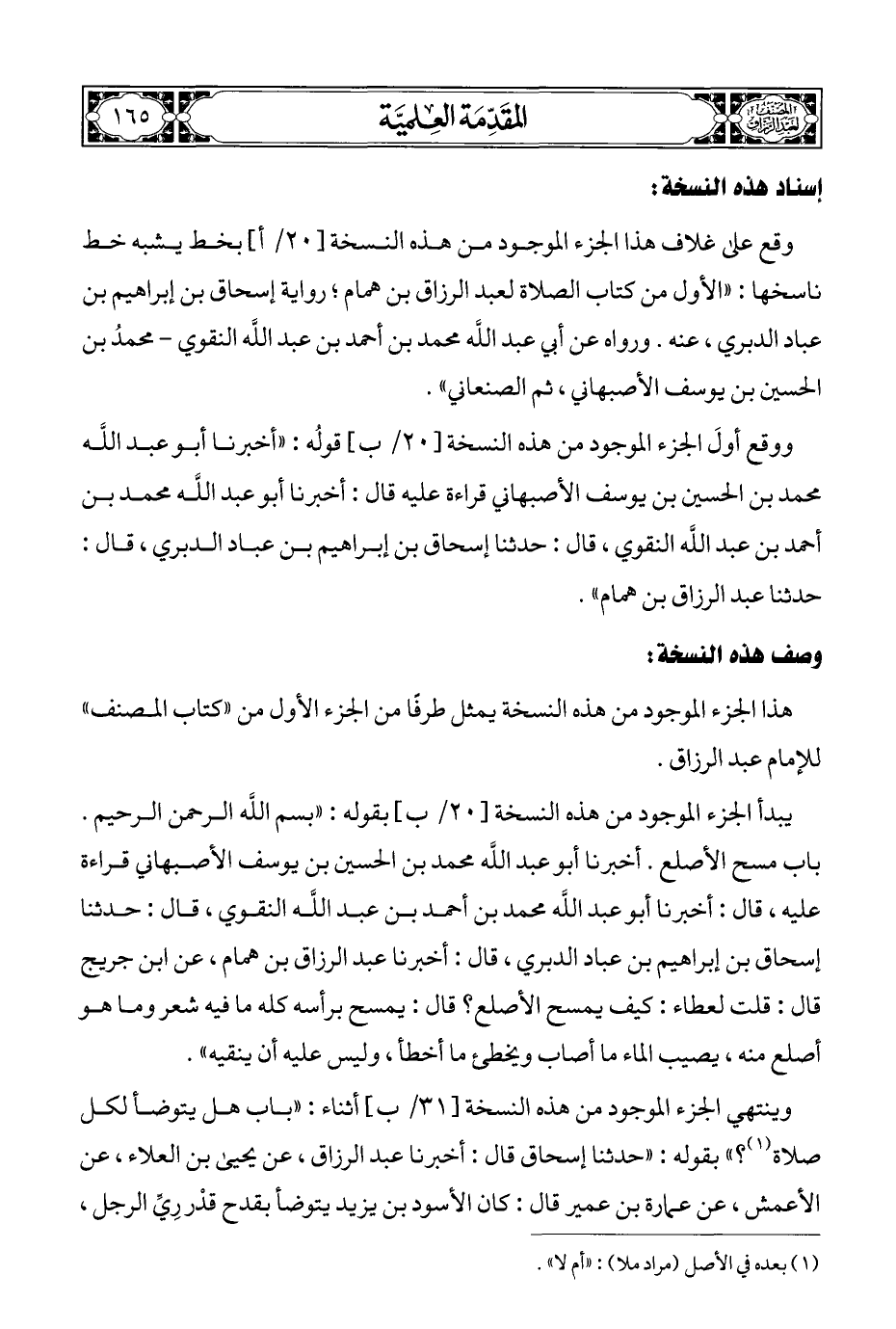 هذا الجزء الموجود من هذه النسخة يمثل طرفًا من الجزء الأول من "كتاب المصنف" للإمام عبد الرزاق.