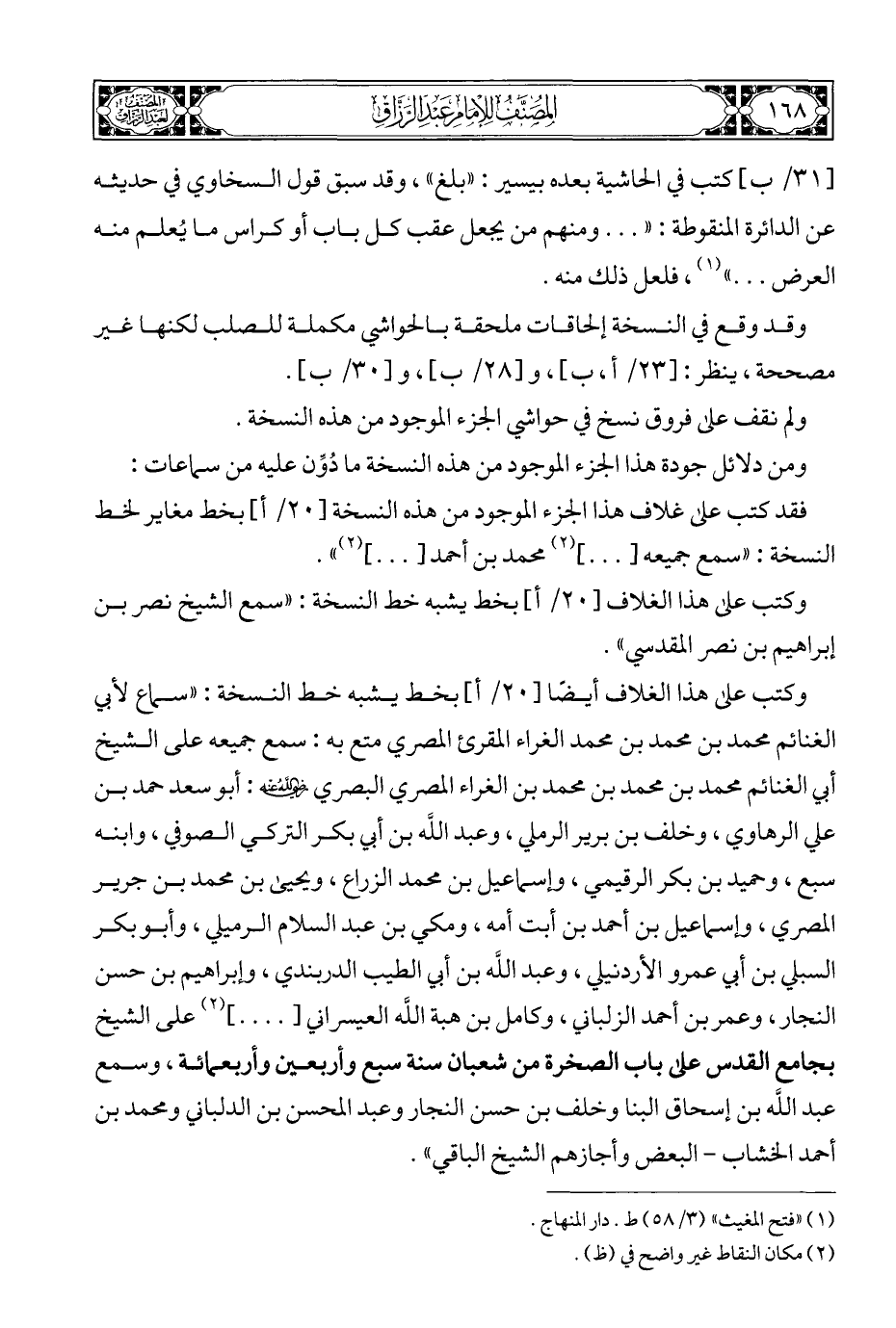 [٣١ / ب] كتب في الحاشية بعده بيسير: "بلغ"، وقد سبق قول السخاوي في حديثه عن الدائرة المنقوطة: " ... ومنهم من يجعل عقب كل باب أو كراس ما يُعلم منه العرض ... " (¬١)، فلعل ذلك منه.