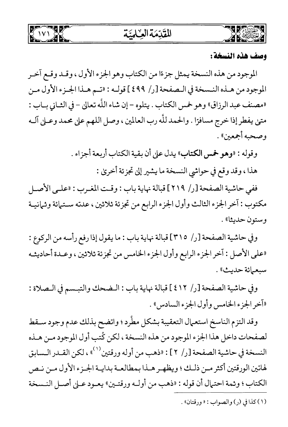 الموجود من هذه النسخة يمثل جزءًا من الكتاب وهو الجزء الأول، وقد وقع آخر الوجود من هذه النسخة في الصفحة [ر/ ٤٩٩] قوله: "تم هذا الجزء الأول من "مصنف عبد الرزاق" وهو خمس الكتاب. يتلوه - إن شاء الله تعالى - في الثاني باب: متى يفطر إذا خرج مسافرًا. والحمد للَّه رب العالمين، وصل اللهم على محمد وعلى آله وصحبه أجمعين".