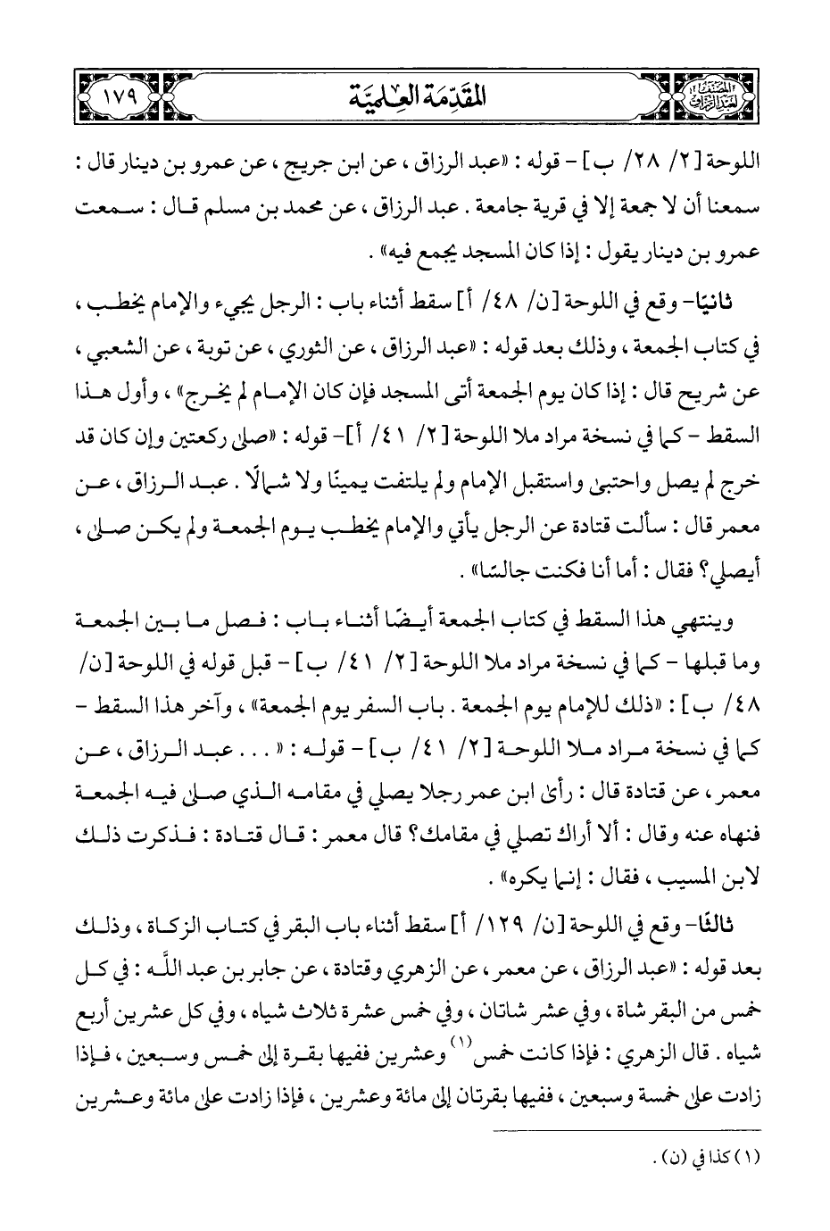 ثانيًا - وقع في اللوحة [ن/ ٤٨/ أ] سقط أثناء باب: الرجل يجيء والإمام يخطب، في كتاب الجمعة، وذلك بعد قوله: "عبد الرزاق، عن الثوري، عن توبة، عن الشعبي، عن شريح قال: إذا كان يوم الجمعة أتى المسجد فإن كان الإمام لم يخرج"، وأول هذا السقط - كما في نسخة مراد ملا اللوحة [٢/ ٤١/ أ]- قوله: "صلى ركعتين وإن كان قد خرج لم يصل واحتبى واستقبل الإمام ولم يلتفت يمينًا ولا شمالًا. عبد الرزاق، عن معمر قال: سألت قتادة عن الرجل يأتي والإمام يخطب يوم الجمعة ولم يكن صلى، أيصلي؟ فقال: أما أنا فكنت جالسًا".