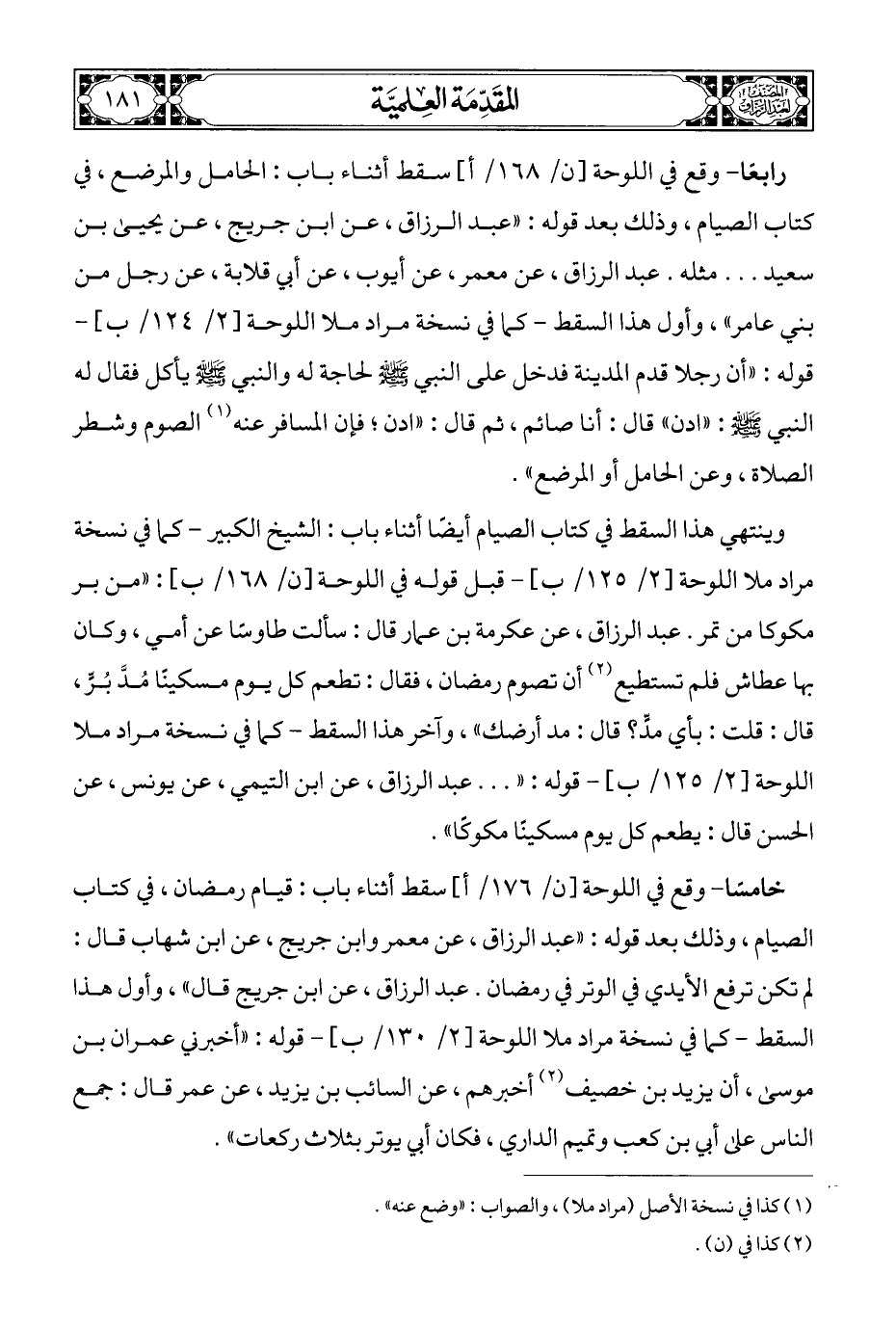 رابعًا - وقع في اللوحة [ن/ ١٦٨/ أ] سقط أثناء باب: الحامل والمرضع، في كتاب الصيام، وذلك بعد قوله: "عبد الرزاق، عن ابن جريج، عن يحيى بن سعيد ... مثله. عبد الرزاق، عن معمر، عن أيوب، عن أبي قلابة، عن رجل من بني عامر"، وأول هذا السقط - كما في نسخة مراد ملا اللوحة [٢/ ١٢٤/ ب]- قوله: "أن رجلا قدم المدينة فدخل على النبي - صلى الله عليه وسلم - لحاجة له والنبي - صلى الله عليه وسلم - يأكل فقال له النبي - صلى الله عليه وسلم -: "ادن" قال: أنا صائم، ثم قال: "ادن؟ فإن المسافر عنه (¬١) الصوم وشطر الصلاة، وعن الحامل أو المرضع".
