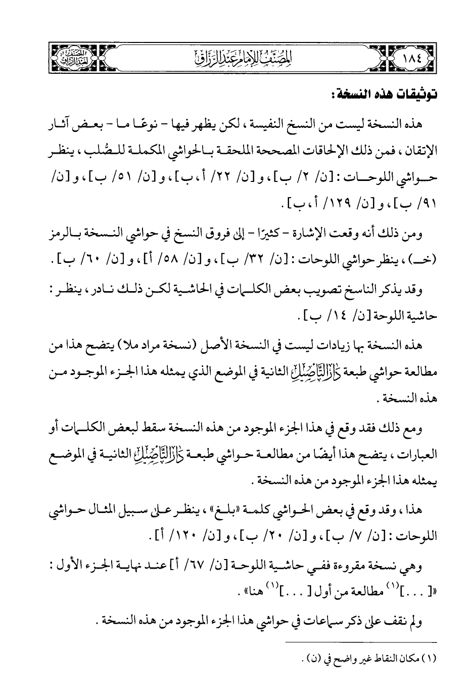 هذا، وقد وقع في بعض الحواشي كلمة "بلغ"، ينظر على سبيل المثال حواشي اللوحات: [ن/ ٧/ ب]، و [ن/ ٢٠/ ب]، و [ن/ ١٢٠/ أ].