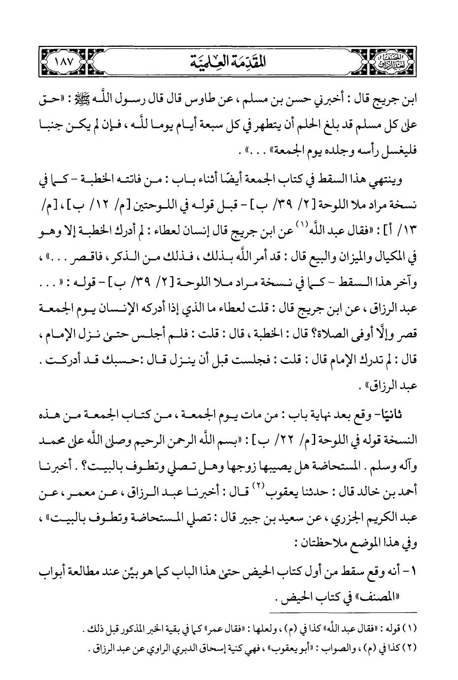 ثانيًا - وقع بعد نهاية باب: من مات يوم الجمعة، من كتاب الجمعة من هذه النسخة قوله في اللوحة [م/ ٢٢/ ب]: "بسم الله الرحمن الرحيم وصلى الله على محمد وآله وسلم. المستحاضة هل يصيبها زوجها وهل تصلي وتطوف بالبيت؟. أخبرنا أحمد بن خالد قال: حدثنا يعقوب (¬٢) قال: أخبرنا عبد الرزاق، عن معمر، عن عبد الكريم الجزري، عن سعيد بن جبير قال: تصلي المستحاضة وتطوف بالبيت"، وفي هذا الموضع ملاحظتان:
