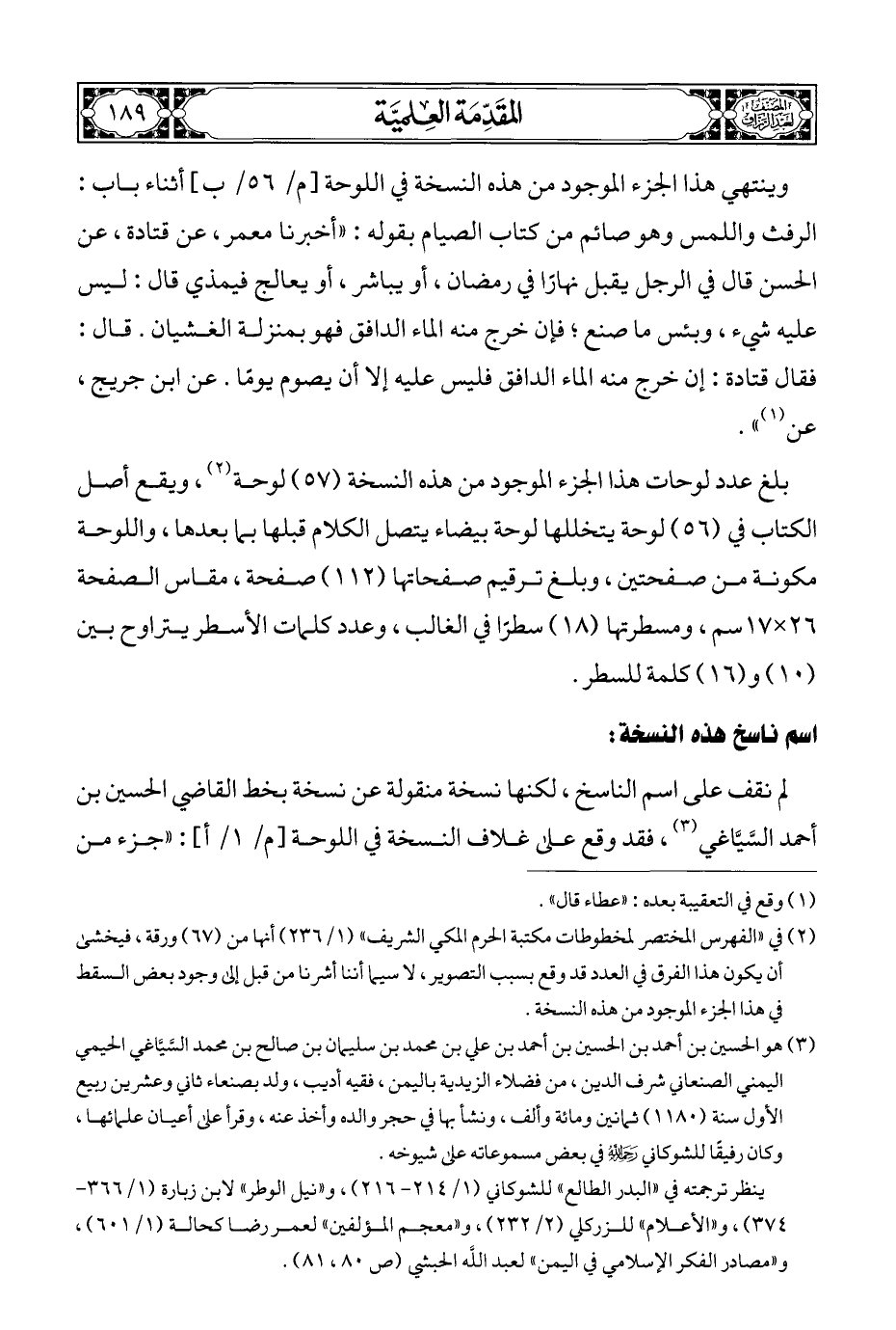 (¬٢) في "الفهرس المختصر لمخطوطات مكتبة الحرم المكي الشريف" (١/ ٢٣٦) أنها من (٦٧) ورقة، فيخشى أن يكون هذا الفرق في العدد قد وقع بسبب التصوير، لا سيما أننا أشرنا من قبل إلى وجود بعض السقط في هذا الجزء الموجود من هذه النسخة.