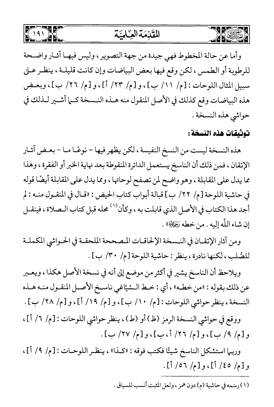 ويلاحظ أن الناسخ يشير في أكثر من موضع إلى أنه في نسخة الأصل هكذا، ويعبر عن ذلك بقوله: "من خطه"، أي: خط السَّيَّاغي ناسخ الأصل المنقول منه هذه النسخة، ينظر حواشي اللوحات: [م/ ١٠/ ب]، و [م/ ١٩/ أ]، و [م/ ٢٨/ ب].