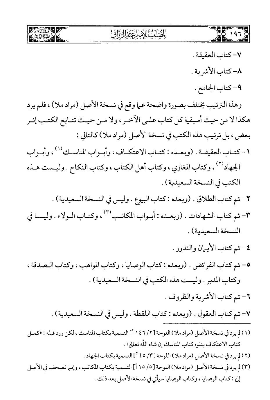 وهذا الترتيب يختلف بصورة واضحة عما وقع في نسخة الأصل (مراد ملا)، فلم يرد هكذا لا من حيث أسبقية كل كتاب على الآخر، ولا من حيث تتابع الكتب إثر بعض، بل ترتيب هذه الكتب في نسخة الأصل (مراد ملا) كالتالي: