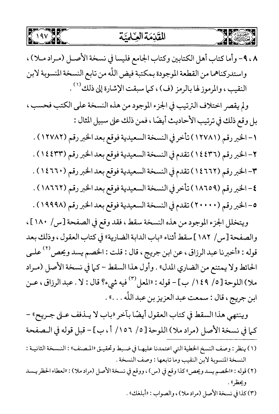 ويتخلل الجزء الموجود من هذه النسخة سقط، فقد وقع في الصفحة [س/ ١٨٠]، والصفحة [س/ ١٨٢] سقط أثناء "باب الدابة الضارية" في كتاب العقول، وذلك بعد قوله: "أخبرنا عبد الرزاق، عن ابن جريج، قال: قلت: الخصم يسد ويحص (¬٢) على الحائط ولا يمتنع من الضاري المدل". وأول هذا السقط - كما في نسخة الأصل (مراد ملا) اللوحة [٥/ ١٤٩/ ب]- قوله: "المعل (¬٣) فيه شيء؟ قال: لا. عبد الرزاق، عن ابن جريج، قال: سمعت عبد العزيز بن عبد الله ... ".