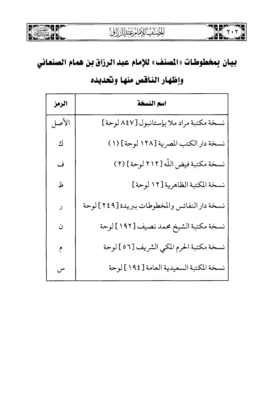 اسم النسخة الرمزنسخة مكتبة مراد ملا بإستانبول [٨٤٧ لوحة] الأصلنسخة دار الكتب المصرية [١٢٨ لوحة] (١) كنسخة مكتبة فيض الله [٢١٢ لوحة] (٢) فنسخة المكتبة الظاهرية [١٢ لوحة] ظنسخة دار النفائس والمخطوطات ببريدة [٢٤٩] رنسخة مكتبة الشيخ محمد نصيف [١٩٢] لوحة ننسخة مكتبة الحرم المكي الشريف [٥٦] لوحة منسخة المكتبة السعيدية العامة [١٩٤] لوحة س