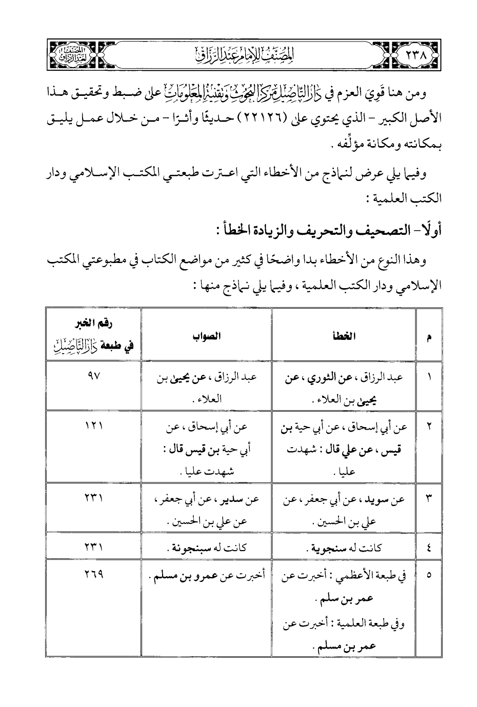م الخطأ الصواب رقم الخبر في طبعة دَار التَّأْصِيلِ١ عبد الرزاق، عن الثوري يحيى بن العلاء عن عبد الرزاق، عن يحيى بن العلاء ٩٧٢ عن أبي إسحاق، عن أبي حية قيس، عن علي قال: شهدت عليا بن عن أبي إسحاق، عن أبي حية بن قيس قال: شهدت عليا ١٢١٣ عن سويد، عن أبي جعفر، عن علي بن الحسين عن سدير، عن أبي جعفر، عن علي بن الحسين ٢٣١٤ كانت له سنجوية كانت له سبنجونة ٢٣١٥ في طبعة الأعظمي: أخبرت عن عمر بن سلم وفي طبعة العلمية: أخبرت عن عمربن مسلم أخبرت عن عمرو بن مسلم ٢٦٩