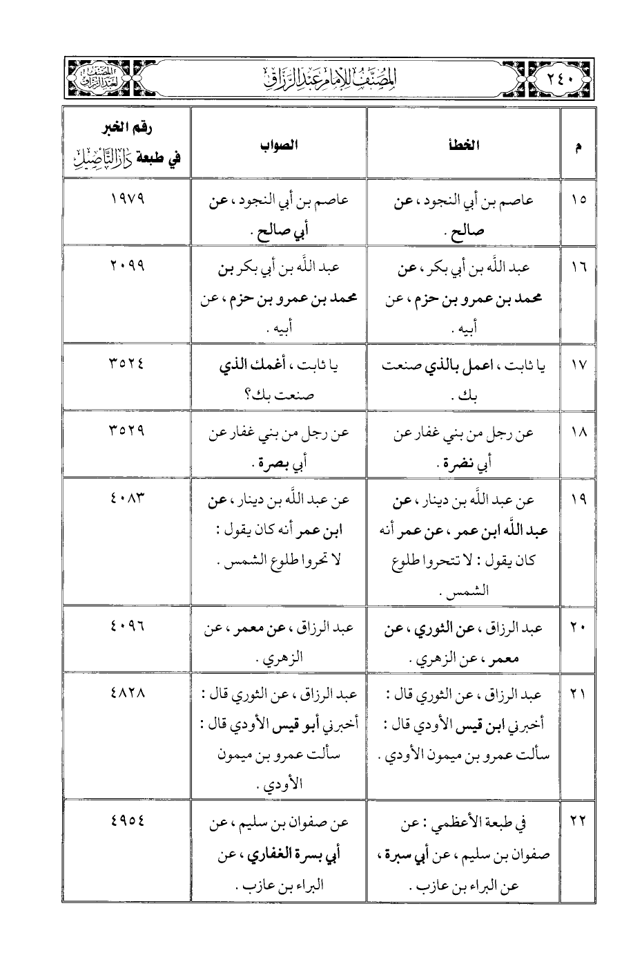 م الخطأ الصواب رقم الخبر في طبعة دَار التَّأْصِيلِ١٥ عاصم بن النجود عن صالح. عاصم بن النجود عن عن أبي صالح. ١٩٧٩١٦ عبد الله بن أبي بكر، عن محمد بن عمرو بن حزم، عن أبيه عبد الله بن أبي بكر، عن محمد بن عمرو بن حزم، عن أبيه. ٢٠٩٩١٧ يا ثابت، اعمل بالذي صنعت بك. يا ثابت، أغمك بالذي صنعت بك؟ ٣٥٢٤١٨ عن رجل من بني غفار عن أبي نضرة. عن رجل من بني غفار عن أبي بصرة. ٣٥٢٩١٩ عن عبد الله بن دينار، عن عبد الله بن عمر، عن عمر أنه كان يقول: لا تتحروا طلوع الشمس. عن عبد الله بن دينار، ابن عمر، أنه كان يقول: لا تتحروا طلوع الشمس. ٤٠٨٣٢٠ عبد الرزاق، عن الثوري، عن معمر، عن الزُّهري. عبد الرزاق، عن معمر، عن الزُّهري. ٤٠٩٦٢١ عبد الرزاق، عن الثوري قال: أخبرني ابن قيس الأودي قال: سألت عمرو بن ميمون الأودي. عبد الرزاق، عن الثوري قال: أخبرني ابن قيس الأودي قال: سألت عمرو بن ميمون الأودي. ٤٨٢٨٢٢ في طبعة الأعظمي: عن صفوان بن سليم، عن أبي سبرة، عن البراء بن عازب. وفي طبعة العلمية: عن صفوان بن سليم، عن النخعي، عن البراء بن عازب. عن صفوان بن سليم، عن أبي بسرة الغفاري، عن البراء بن عازب. ٤٩٥٤