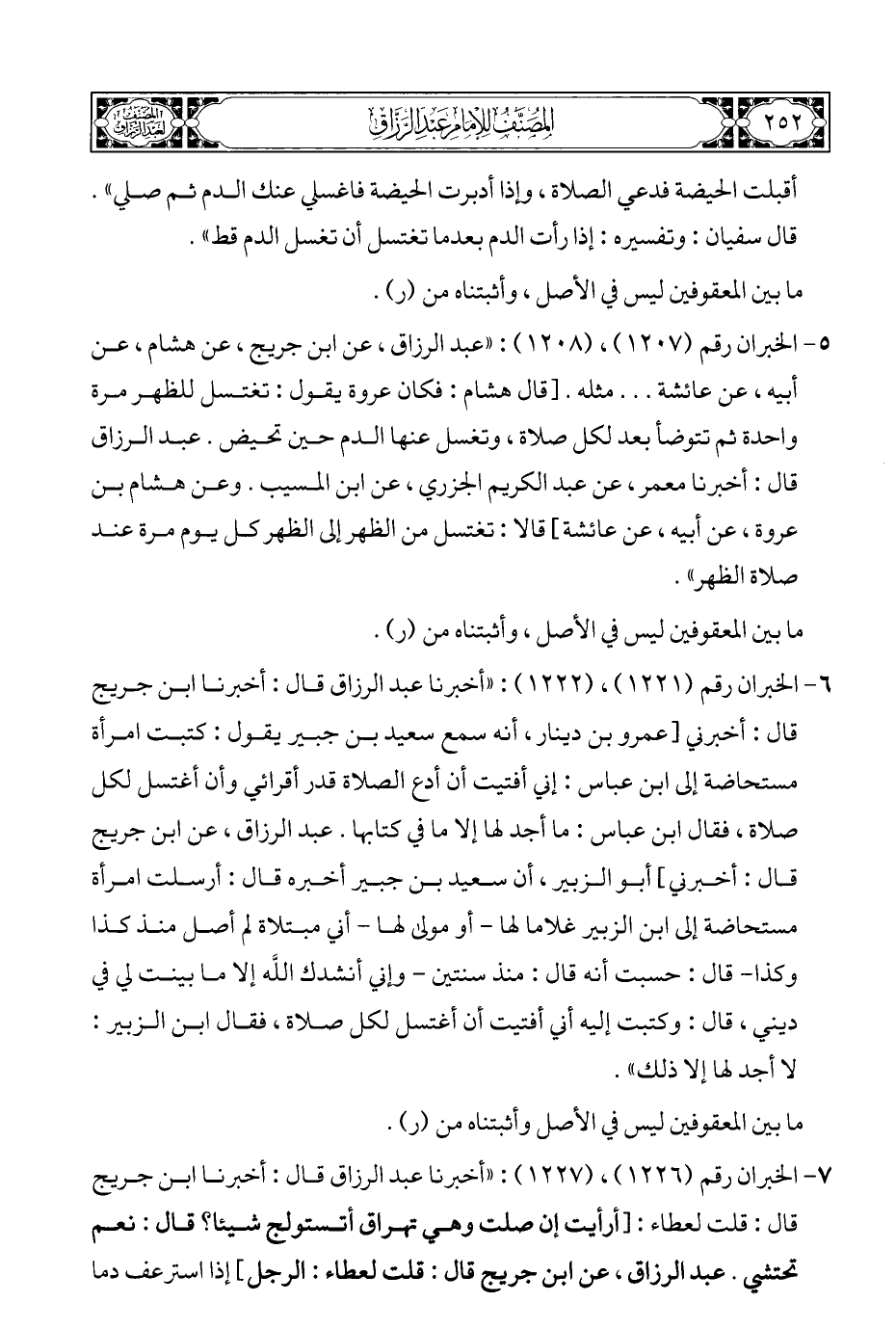 ٧ - الخبران رقم (١٢٢٦)، (١٢٢٧): "أخبرنا عبد الرزاق قال: أخبرنا ابن جريج قال: قلت لعطاء: [أرأيت إن صلت وهي تهراق أتستولج شيئا؟ قال: نعم تحتشي. عبد الرزاق، عن ابن جريج قال: قلت لعطاء: الرجل] إذا استر عف دما