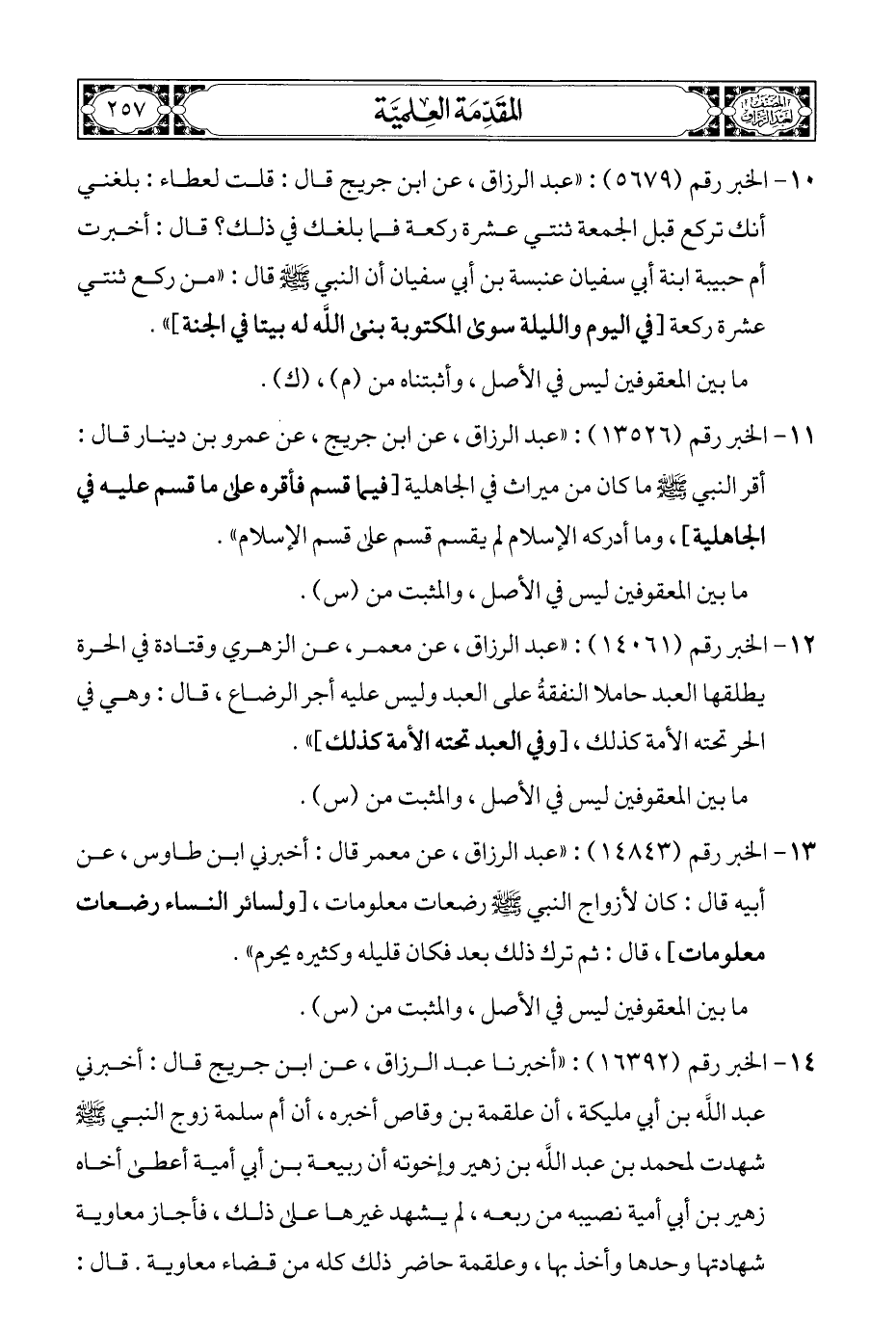 ١٠ - الخبر رقم (٥٦٧٩): "عبد الرزاق، عن ابن جريج قال: قلت لعطاء: بلغني أنك تركع قبل الجمعة ثنتي عشرة ركعة فما بلغك في ذلك؟ قال: أخبرت أم حبيبة ابنة أبي سفيان عنبسة بن أبي سفيان أن النبي - صلى الله عليه وسلم - قال: "من ركع ثنتي عشرة ركعة [في اليوم والليلة سوى المكتوبة بنى الله له بيتا في الجنة] ".