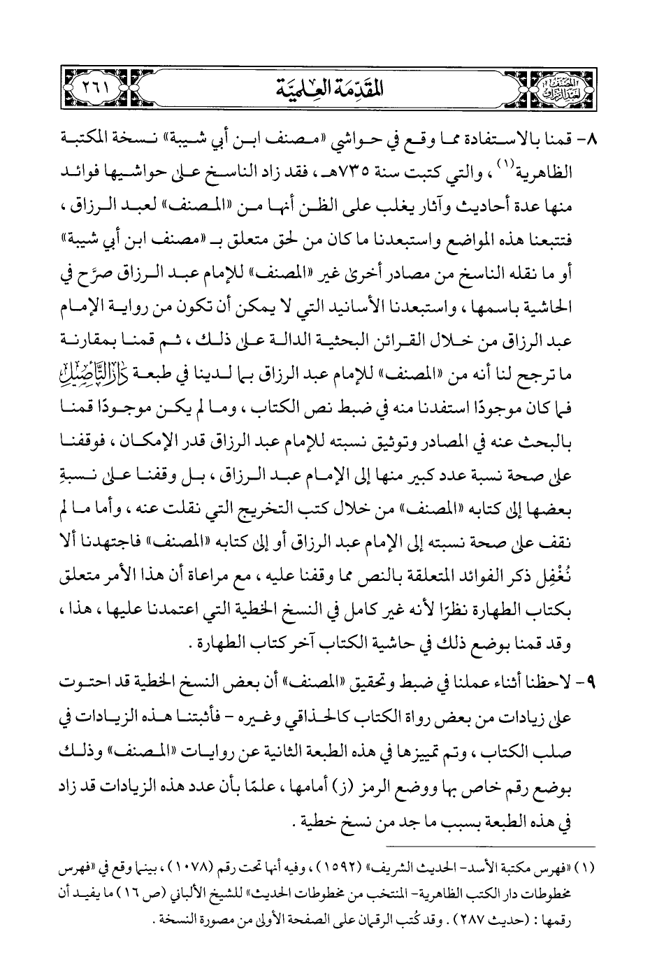 ٨ - قمنا بالاستفادة مما وقع في حواشي "مصنف ابن أبي شيبة" نسخة المكتبة الظاهرية (¬١)، والتي كتبت سنة ٧٣٥ هـ، فقد زاد الناسخ على حواشيها فوائد منها عدة أحاديث وآثار يغلب على الظن أنها من "المصنف" لعبد الرزاق، فتتبعنا هذه المواضع واستبعدنا ما كان من لحق متعلق بـ "مصنف ابن أبي شيبة" أو ما نقله الناسخ من مصادر أخرى غير "المصنف" للإمام عبد الرزاق صرَّح في الحاشية باسمها، واستبعدنا الأسانيد التي لا يمكن أن تكون من رواية الإمام عبد الرزاق من خلال القرائن البحثية الدالة على ذلك، ثم قمنا بمقارنة ما ترجح لنا أنه من "المصنف" للإمام عبد الرزاق بما لدينا في طبعة دار التأصيل فما كان موجودًا استفدنا منه في ضبط نص الكتاب، وما لم يكن موجودًا قمنا بالبحث عنه في المصادر وتوثيق نسبته للإمام عبد الرزاق قدر الإمكان، فوقفنا على صحة نسبة عدد كبير منها إلى الإمام عبد الرزاق، بل وقفنا على نسبةِ بعضها إلى كتابه "المصنف" من خلال كتب التخريج التي نقلت عنه، وأما ما لم نقف على صحة نسبته إلى الإمام عبد الرزاق أو إلى كتابه "المصنف" فاجتهدنا ألا نُغْفِل ذكر الفوائد المتعلقة بالنص مما وقفنا عليه، مع مراعاة أن هذا الأمر متعلق بكتاب الطهارة نظرًا لأنه غير كامل في النسخ الخطية التي اعتمدنا عليها، هذا، وقد قمنا بوضع ذلك في حاشية الكتاب آخر كتاب الطهارة.
