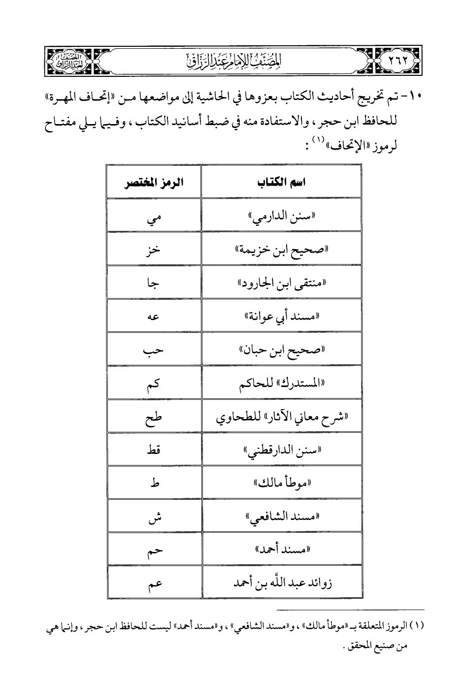 اسم الكتاب الرمز المختصر"سنن الدارمي" مي"صحيح ابن خزيمة" خز"منتقى ابن الجارود" جا"مسند أبي عوانة" عه"صحيح ابن حبان" حب"المستدرك" للحاكم كم"شرح معاني الآثار" للطحاوي طح"موطأ مالك" ط"مسند الشافعي" ش"مسند أحمد" حمزوائد عبد الله بن أحمد عم