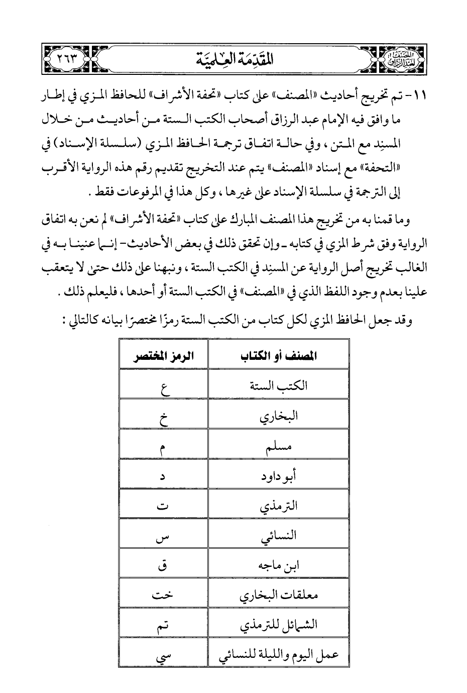 وما قمنا به من تخريج هذا المصنف المبارك على كتاب "تحفة الأشراف" لم نعن به اتفاق الرواية وفق شرط المزي في كتابه - وإن تحقق ذلك في بعض الأحاديث - إنما عنينا به في الغالب تخريج أصل الرواية عن المسنِد في الكتب الستة، ونبهنا على ذلك حتى لا يتعقب علينا بعدم وجود اللفظ الذي في "المصنف" في الكتب الستة أو أحدها، فليعلم ذلك.