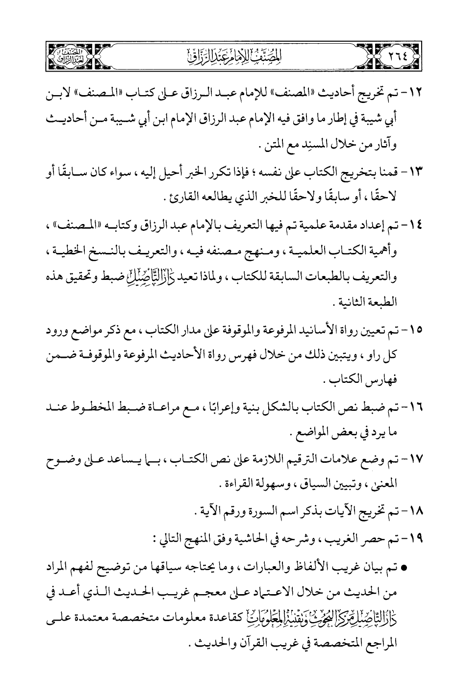 ١٤ - تم إعداد مقدمة علمية تم فيها التعريف بالإمام عبد الرزاق وكتابه "المصنف"، وأهمية الكتاب العلمية، ومنهج مصنفه فيه، والتعريف بالنسخ الخطية، والتعريف بالطبعات السابقة للكتاب، ولماذا تعيد دار التأصيل ضبط وتحقيق هذه الطبعة الثانية.
