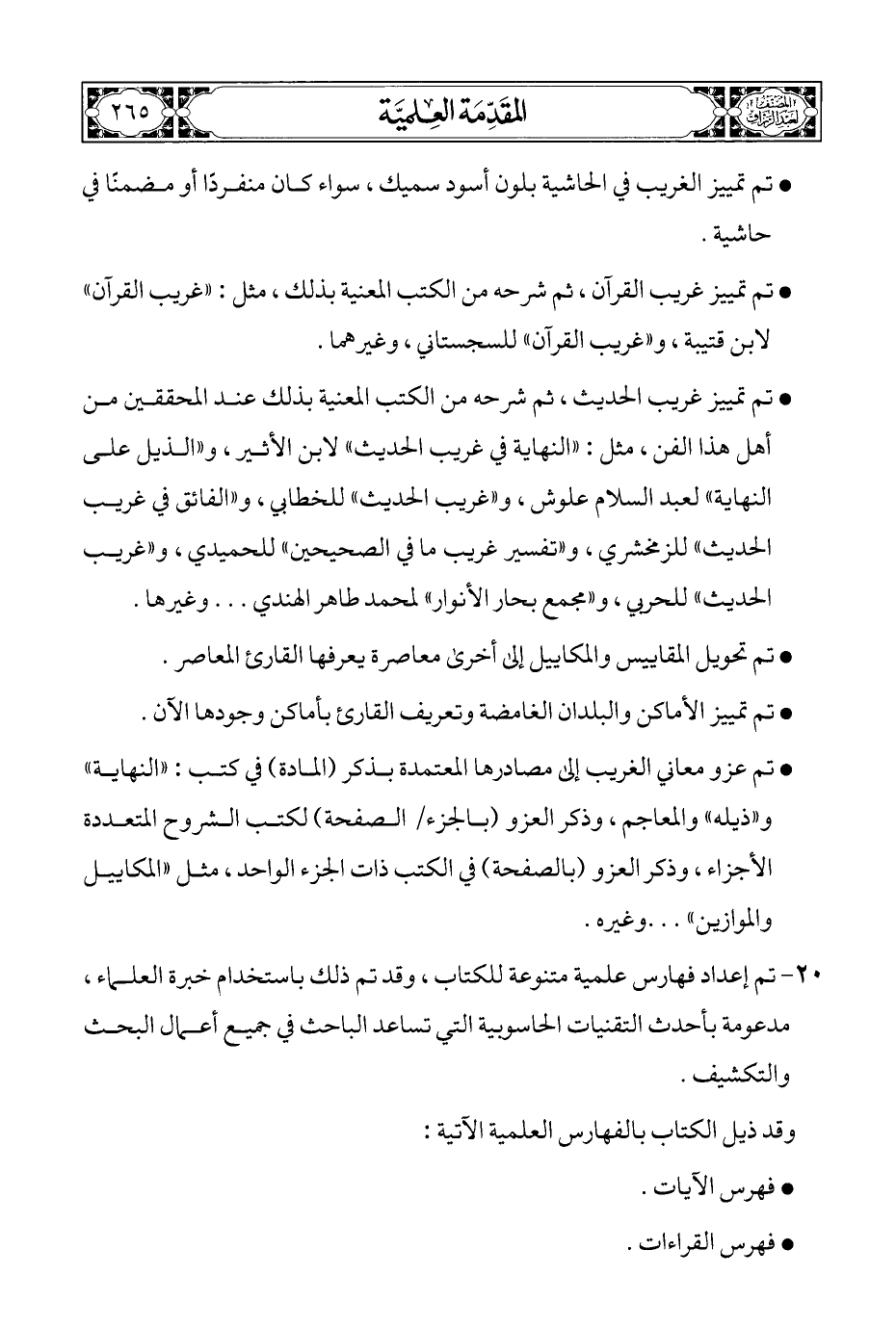 ٢٠ - تم إعداد فهارس علمية متنوعة للكتاب، وقد تم ذلك باستخدام خبرة العلماء، مدعومة بأحدث التقنيات الحاسوبية التي تساعد الباحث في جميع أعمال البحث والتكشيف.