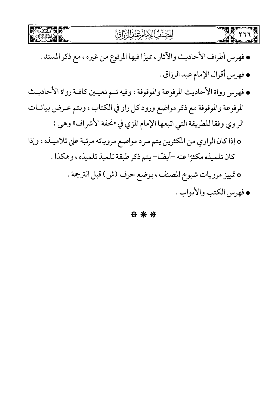 • فهرس أطراف الأحاديث والآثار، مميزًا فيها المرفوع من غيره، مع ذكر المسند.