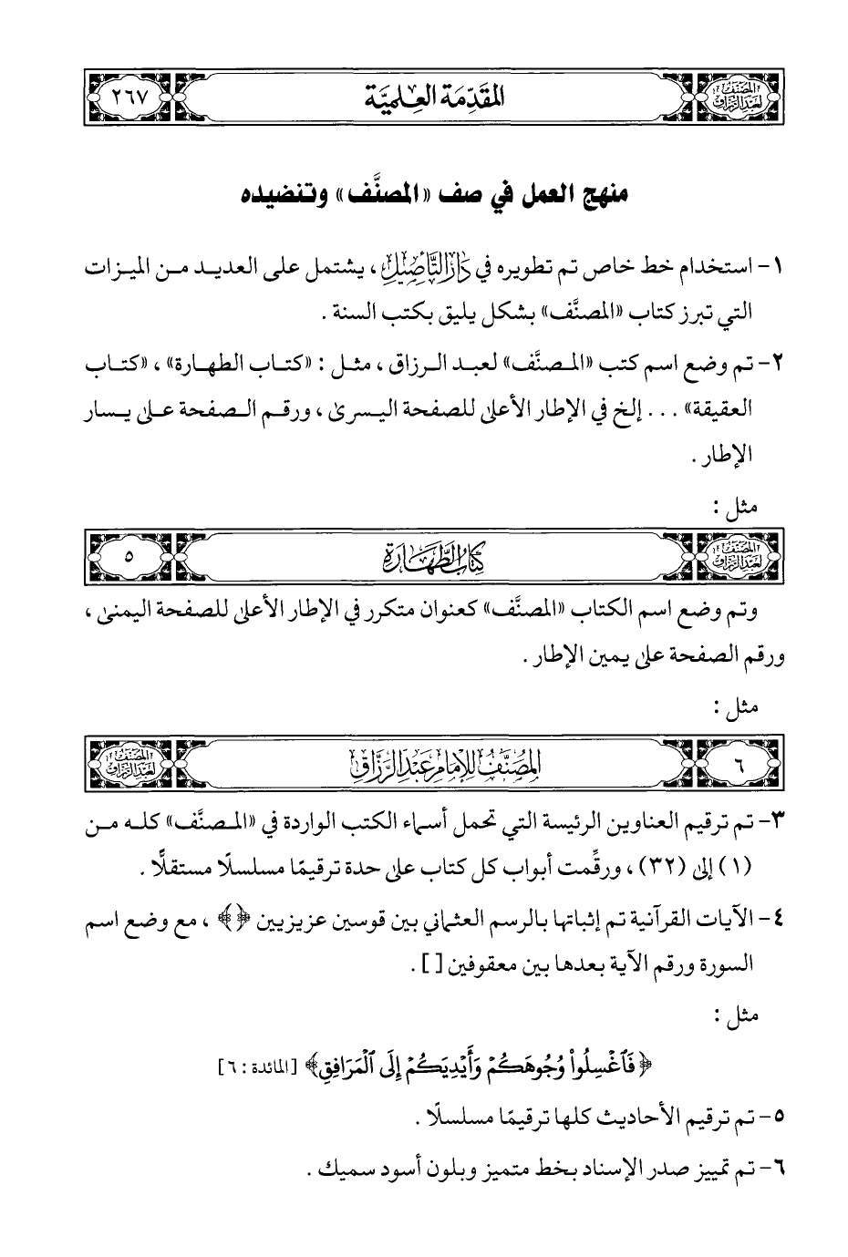 ٢ - تم وضع اسم كتب "المصنَّف" لعبد الرزاق، مثل: "كتاب الطهارة"، "كتاب العقيقة" ... إلخ في الإطار الأعلي للصفحة اليسرى، ورقم الصفحة على يسار الإطار.