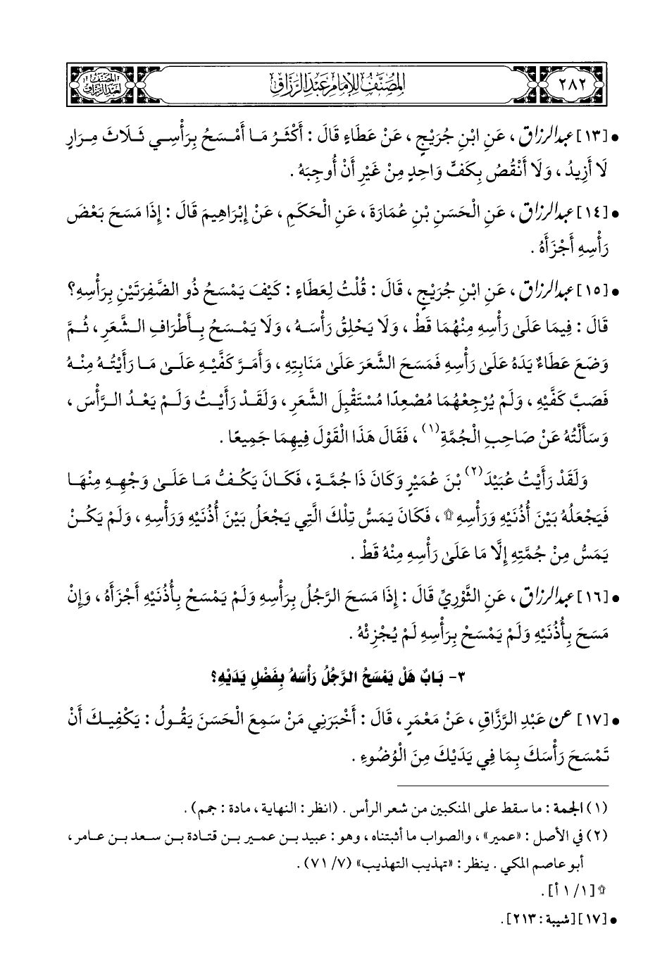 • [١٧] عن عَبْدِ الرَّزَّاقِ، عَنْ مَعْمَرٍ، قَالَ: أَخْبَرَنِي مَنْ سَمِعَ الْحَسَنَ يَقُولُ: يَكْفِيكَ أَنْ تَمْسَحَ رَأْسَكَ بِمَا فِي يَدَيْكَ مِنَ الْوُضُوءِ.