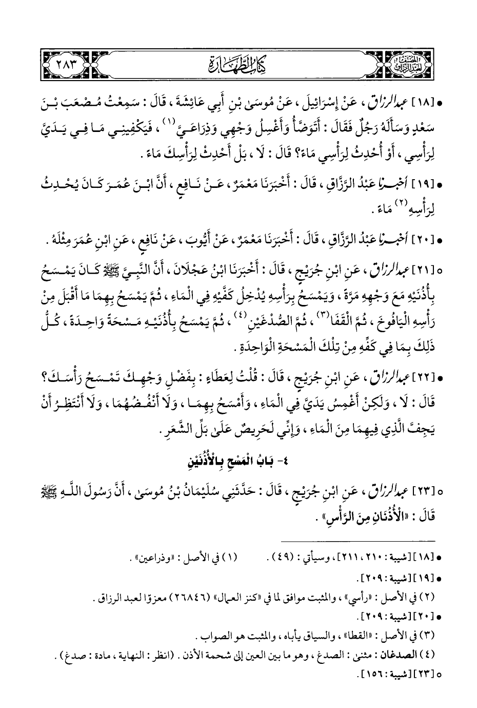 ° [٢٣] عبد الرزاق، عَنِ ابْنِ جُرَيْجٍ، قَالَ: حَدَّثَنِي سُلَيْمَانُ بْنُ مُوسَى، أَنَّ رَسُولَ اللَّهِ - صلى الله عليه وسلم - قَالَ: "الْأُذُنَانِ مِنَ الرَّأْسِ".