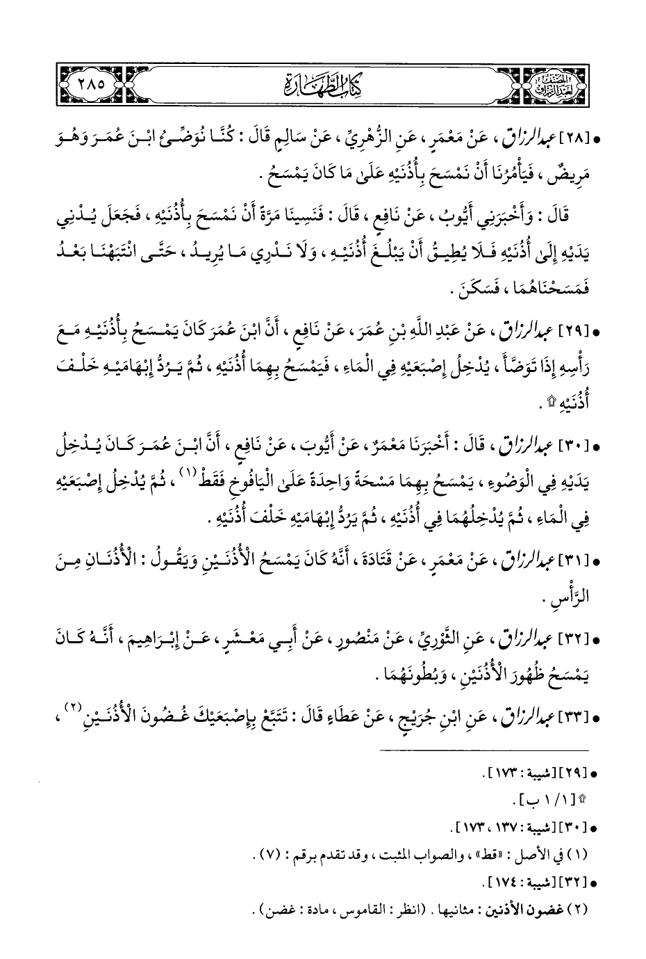 • [٢٩] عبد الرزاق، عَنْ عَبْدِ اللَّهِ بْنِ عُمَرَ، عَنْ نَافِع، أَن ابْنَ عُمَرَ كَانَ يَمْسَحُ بِأُذُنَيْهِ مَعَ رَأْسِه إِذَا تَوَضَّأ، يُدْخِلُ إِصْبَعَيْهِ فِي الْمَاءِ، فَيَمْسَحُ بِهِمَا أُذُنَيْهِ، ثُمَّ يَرُدُّ إِبْهَامَيْهِ خَلْفَ أُذُنَيْهِ *.